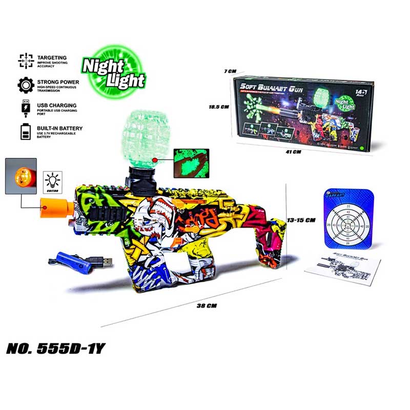 Це захоплююча іграшка для любителів мілітарного стилю та неонових ефектів. Цей автомат не лише імітує зовнішній вигляд популярної моделі AK-47, але також має яскраві неонові орбізи, які створюють ефектне світіння.