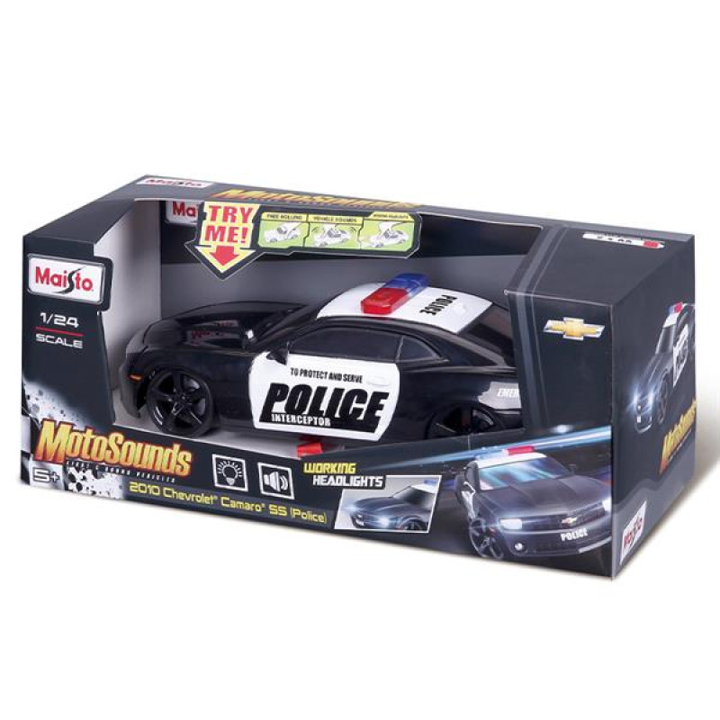 Колекційні моделі Maisto Chevrolet Camaro SS RS (Police) #8211; чудовий подарунок для хлопчиків від 8 років, які люблять машини та спеціальну техніку. Це точна ліцензійна копія автомобіля, виконана у масштабі 1:24.Модель виконана із якісного пластику.Добре деталізована. Колеса обертаються. При натисканні на капот #8211; світяться фари.Для роботи необхідні 2 батареї АА (входять до комплекту).