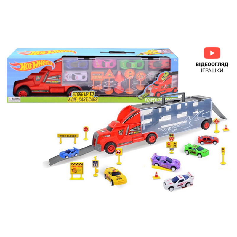 Автовоз із 6 спортивними машинками та знаками - дасть змогу весело проводити час, вивчаючи знаки руху та запускаючи машинки з даху через кузов. Зберігати машинки зручно всередині автовозу. Така іграшка - найкращий подарунок для хлопчика.