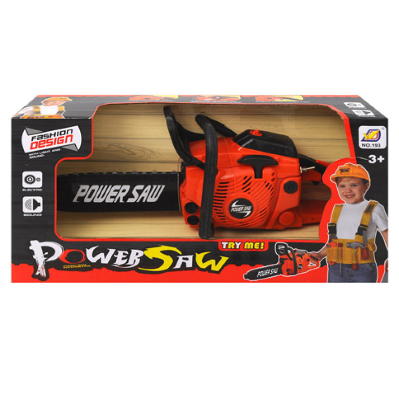 Бензопила музична - бензопила на батарейках, добре деталізована, під час увімкнення крутиться стрічка й інструмент видає звук справжньої бензопили.