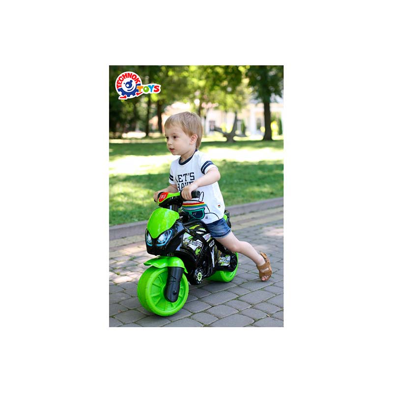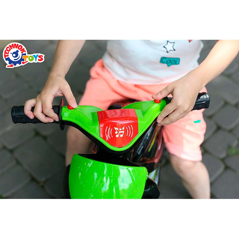 Мотоцикл ТехноК, вражає сучасним дизайном і електронними можливостями. Його основна унікальність полягає у великих і міцних колесах, виготовлених способом видування, що забезпечує тиху їзду. Це дасть змогу маленькому любителю байків насолоджуватися їздою навіть удома, не турбуючи сусідів.