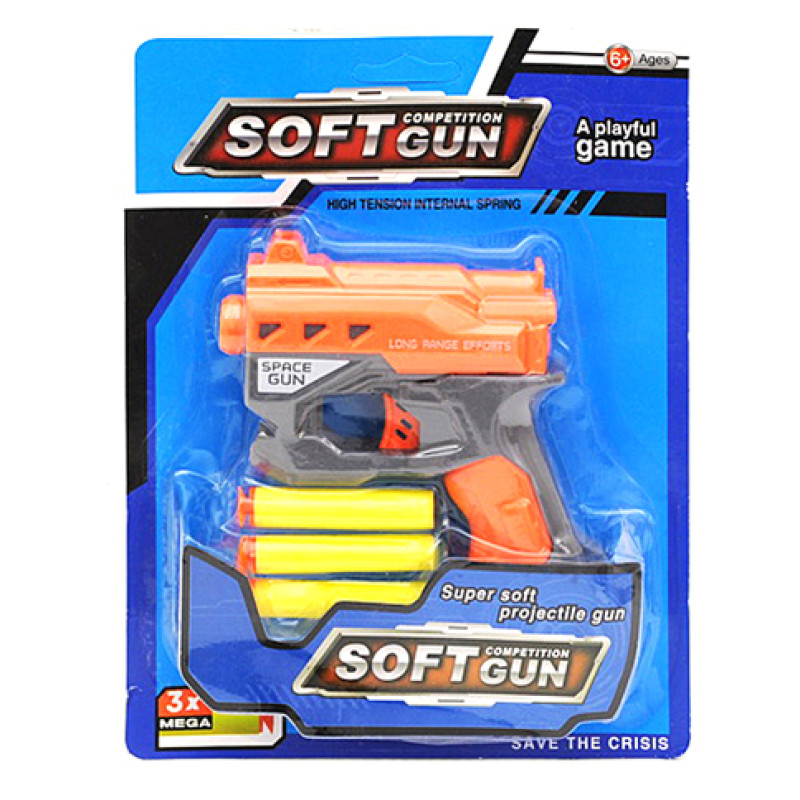 Помаранчевий бластер виготовлений із пластику, стріляє поролоновими кулями.