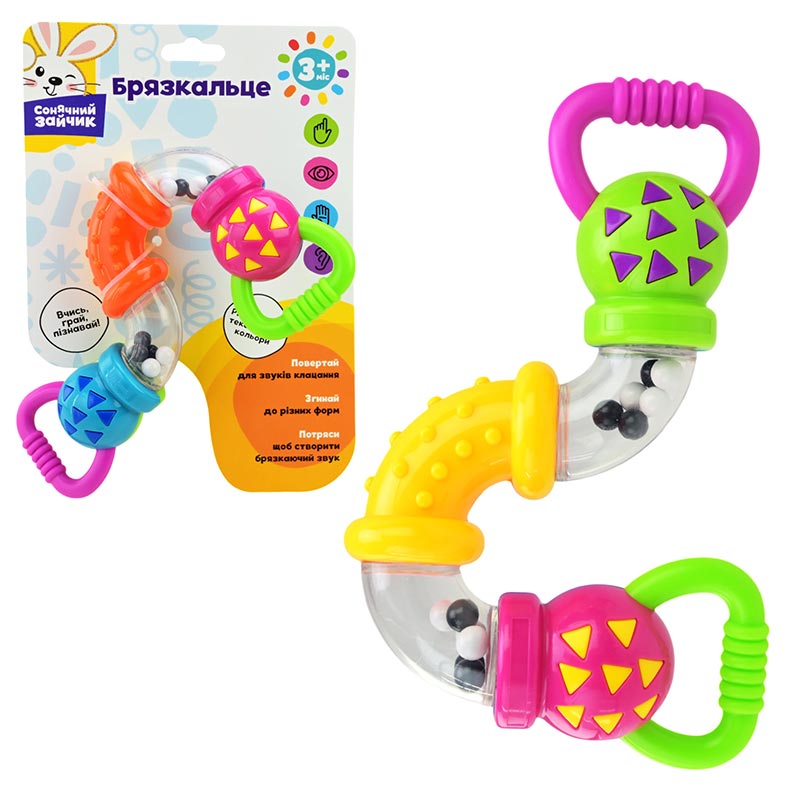 Іграшка виготовлена з безпечних матеріалів, не містить дрібних деталей і легко поміщається в маленьких ручках. Брязкальце стимулює слух, зір і тактильні відчуття, а також допомагає розвивати координацію рухів та хватальний рефлекс.