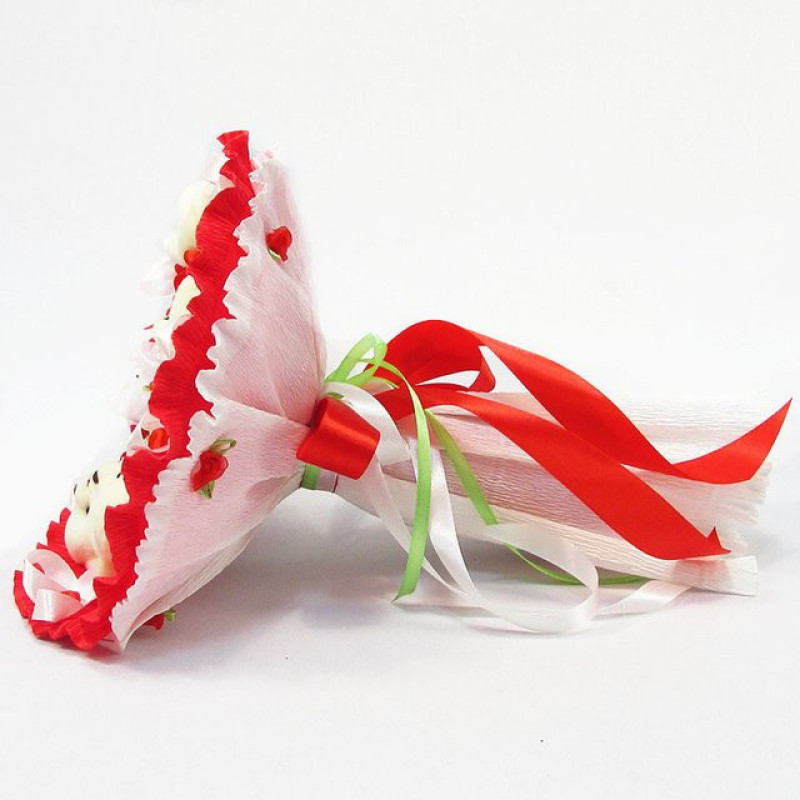 Букет з іграшок Ведмедики 5 червоний Арт. 5289 Букет з іграшок Ведмедики 5 червоний зроблений з біленьких ведмежат. Вони дуже кумедні, на шийці кожного з них пов'язаний бантик. У центрі букетика розташована красиво оформлена біла квітка з вкрапленнями маленьких червоних трояндочок. Між ведмедиками прикріплені бантики з трояндочками. Зовні композиція виконана в червоно-білому кольорі. Ручка букета прикрашена красивими атласними стрічками. Незвичайний плюшевий букет стане родзинкою свята. Він зможе по-справжньому здивувати і порадувати дорогу людину. Композиція складається з 5 ведмежат. Розміри букета 27х30 см. При відправці Новою поштою букет пакується в коробку з об'ємною вагою 5 кг. Оскільки композиція є авторською, повторити її двічі до найдрібніших деталей неможливо, деякі елементи декору можуть бути змінені, при цьому зберігається загальний стиль композиції. ВАЖЛИВО! Дані букети виготовляються під замовлення, тільки по передоплаті. Термін виготовлення 1-2 дні. Поверненню та обміну не підлягають.