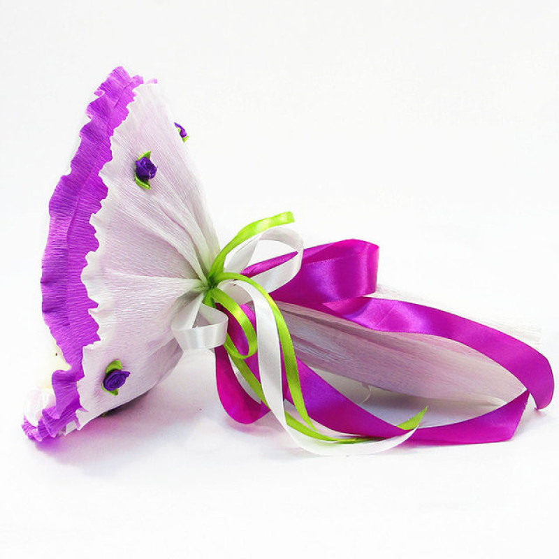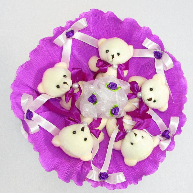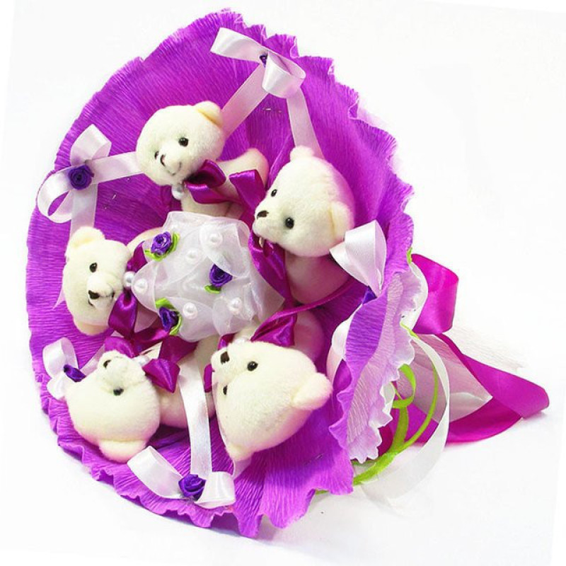 ВАЖЛИВО! Дані букети виготовляються під замовлення, тільки по передоплаті. Термін виготовлення 1-2 дні. Поверненню та обміну не підлягають.Букет з іграшок Ведмедики 5 бузковий Арт. 5291 зроблений з ведмежат білого кольору. Ведмедики дуже милі, у них на шиях зав'язані бантики. У центрі букетика розташована красиво оформлена біла квітка з вкрапленнями бузкових трояндочок. Між іграшками прикріплені бантики з трояндочками. Зовнішнє оформлення композиції виконано в біло-бузковій кольоровій гамі. Ручка букета декорована атласними стрічками. Витончений плюшевий букет привертає увагу. Такий букетик зуміє передати всю теплоту і ніжність дорогій людині. Композиція складається з 5 ведмежат. Розміри букета 27х30 см. При відправці Новою поштою букет пакується в коробку з об'ємною вагою 5 кг. Оскільки композиція є авторською, повторити її двічі до найдрібніших деталей неможливо, деякі елементи декору можуть бути змінені, при цьому зберігається загальний стиль композиції. ВАЖЛИВО! Дані букети виготовляються під замовлення, тільки по передоплаті. Термін виготовлення 1-2 дні. Поверненню та обміну не підлягають.