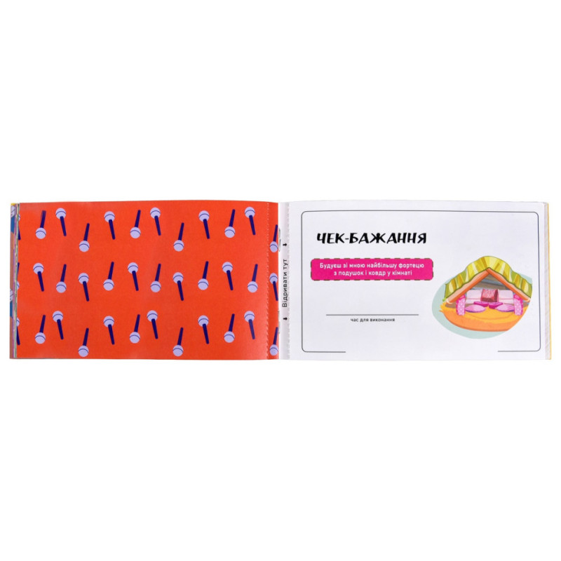 Чекова книжка бажань "Для друзів" — це веселий набір завдань, створений для тих, хто хоче додати більше емоцій і різноманіття до зустрічей із друзями. У книжці — 32 чеки, кожен з яких можна відірвати та виконати у зручний момент, записавши дату здійснення. Формат книжки дає змогу легко обирати активності залежно від настрою: від дружніх викликів до милих жестів підтримки.