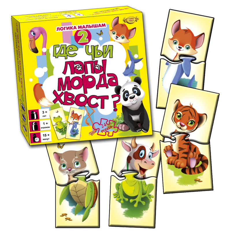 Гра Де чиї лапи, морда, хвіст? 2 - навчає дитину з'єднувати частину та ціле.