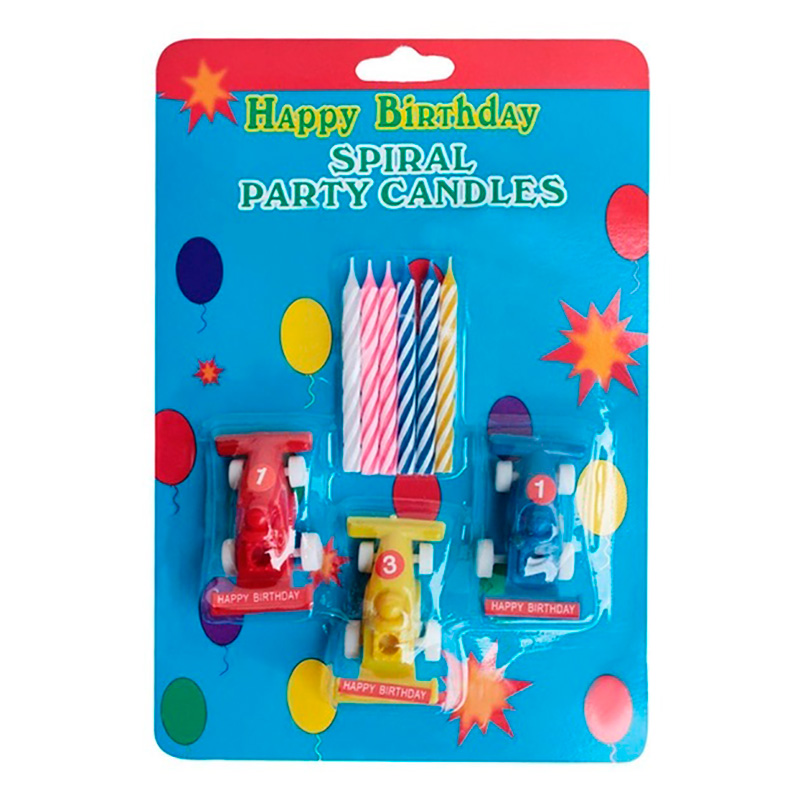 Набір святкових свічок для торта з підставками-машинками на планшеті