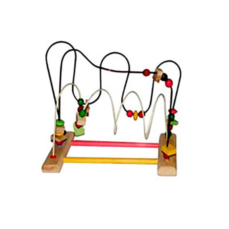 Іграшка призначена для дітей віком від 3 років, складається з дерев'яної фарбованої в рожевий та жовтий колір платформи-підставки розміром 22,5?15?2 см - 1 шт., металевих вигнутих фарбованих у білий та червоний кольори прутів довжиною від 15 см та 25 см - 2 шт., на короткий нанизано 10, а на довгий 15 дерев'яних фарбованих у жовтий, червоний, синій, зелений, білий та блакитний колір фігур округлої форми. Загальна висота виробу 15 см. Упаковано в термоплівку та якісну гофрокартонну коробку.