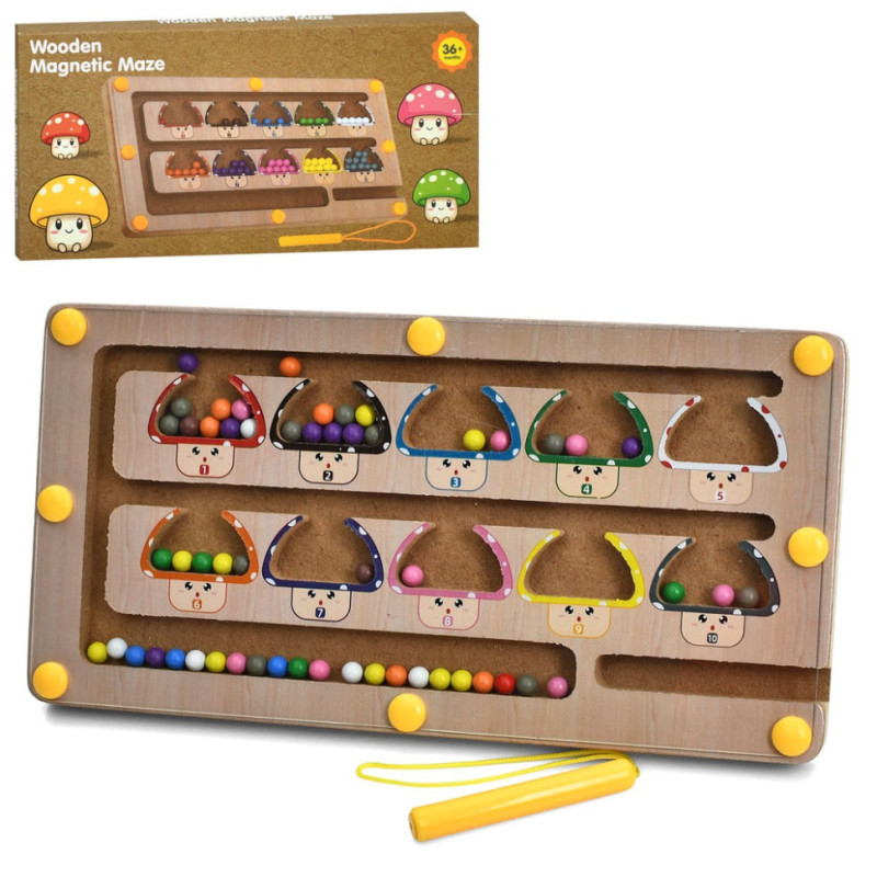 Познайомте малюка з чарівним світом логіки та спритності! Ця чудова дерев'яна іграшка-лабіринт перетворить навчання на захопливу гру. За допомогою спеціальної магнітної палички дитина повинна провести маленькі кольорові кульки по хитромудрих доріжках, розвиваючи: