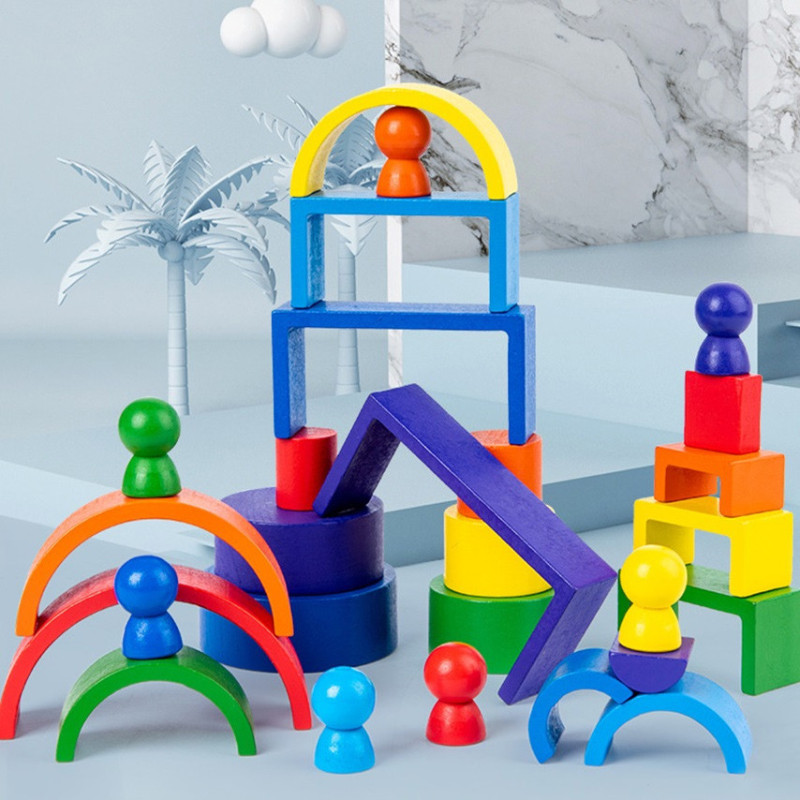 Ця дерев’яна іграшка включає різноманітні елементи, такі як дуги, прямокутники, круги та фігурки, що дозволяє створювати безліч конструкцій і моделей. Кожен елемент виконаний у кольорах веселки, що додає грі яскравості і привабливості.