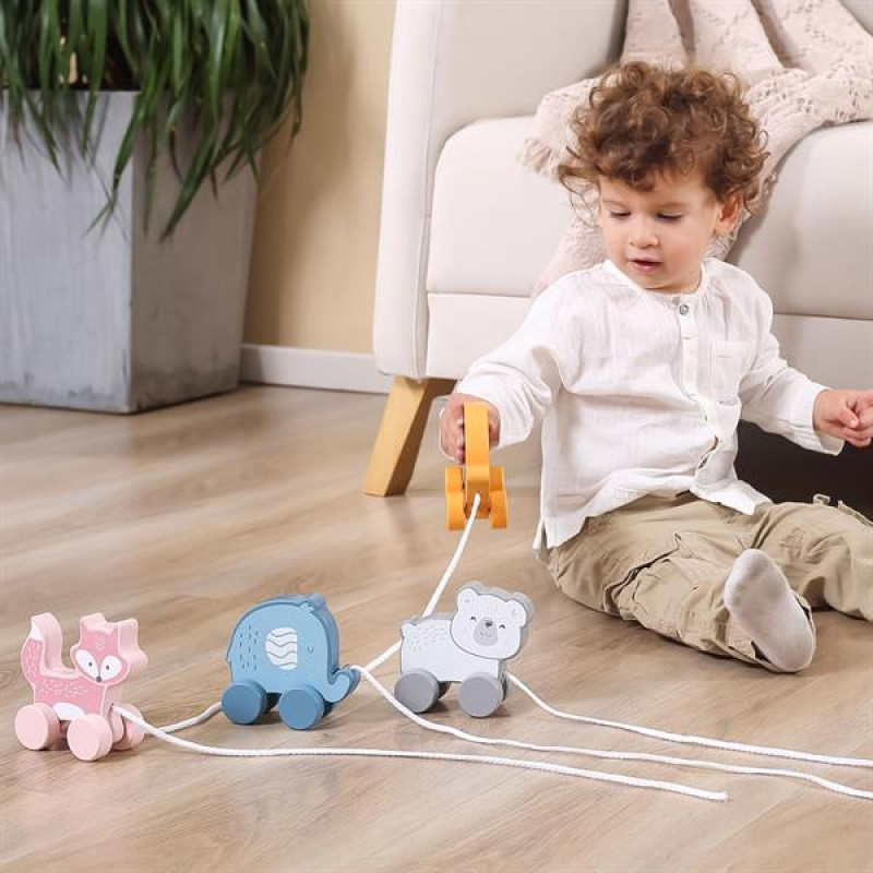 Дерев'яна іграшка-каталка PolarB для малюків від 1,5 року. Виконана у вигляді милої тварини на чотирьох колесах зі шнурком, пофарбована в пастельні кольори.Для виготовлення каталки використана якісна деревина і безпечні барвники. Всі краї та деталі ретельно відшліфовані. Іграшка-каталка відповідає стандартам безпеки та якості: європейському EN71, американському ASTM, як і вся продукція PolarB.