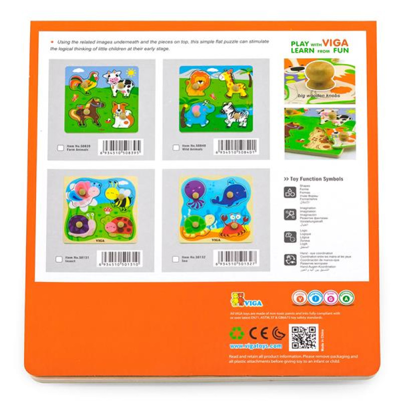 Чи можна дитину до двох років зацікавити вивченням навколишнього світу? Так, якщо надати їй цікавий матеріал #8211; дитячі пазли. Дерев'яна рамка-вкладиш Viga Toys Комахи розроблена спеціально для допитливих малюків від 18 місяців.Пазл-вкладиш складається з дерев'яної основи із зображенням зеленої галявини під блакитним небом і 4 вкладених деталей у вигляді равлика, жука сонечка, бджілки, метелика. На кожній плоскій фігурці є маленька рукоятка, за яку зручно братися і розставляти по місцях елементи пазла.Ця нескладна розвивальна іграшка чудово тренує моторику рук і логічне мислення. Дитині необхідно збагнути не лише куди, але і як правильно вставити картинку. Завдяки рукояткам у центрі вкладок, малюк не сплутає лицьову сторону з оборотом, і швидше запам'ятає розташування звіряток на основі. Рамки-вкладиші добре підходять для занять за методикою Монтессорі.Дерев'яна рамка-вкладиш від Viga Toys Комахи виготовлена з якісного екологічного матеріалу, всі краї відшліфовані, кути згладжені. Вкрита яскравими безпечними фарбами. Відповідає стандартам дитячих іграшок EN71 і ASTM.Пазл має картинки-підказки під вкладишами.