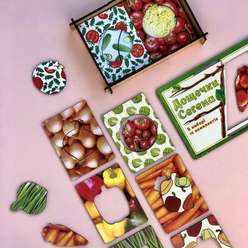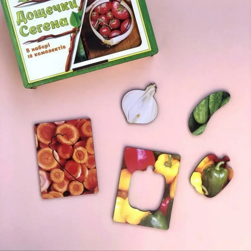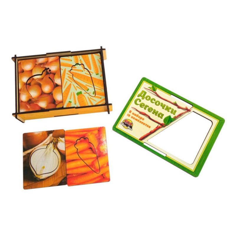 Дощечки Сегена "Овочі". Запропонуйте малюкові знайти кожному овочу свій "будиночок-рамочку". Зверніть увагу дитини на те, що кожен овоч повинен збігтися з потрібним "будиночком" не тільки формою, але і малюнком. Промовляйте назви всіх овочів, таким чином малюк запам'ятає їх легко та швидко. Знайдіть з дитиною однакові вкладки (цілих і в розрізі), порахуйте їх. Поговоріть про те, які ці овочі смакують: кислі або солоні. У коробці: 18 дощок із малюнками різних овочів. 1. Розвиток логічного та понятійного мислення. 2. За допомогою такого методичного матеріалу діти пізнають навколишній світ. 3. Розвивається дрібна моторика. Дістаючи і вставляючи певним чином деталі сортера, чудово тренуються пальчики. 4. Працює зорова пам'ять, тренується увага та посидючість. Розмір дошки: 10х7,5 см, коробки: 17,5х12х4 см.