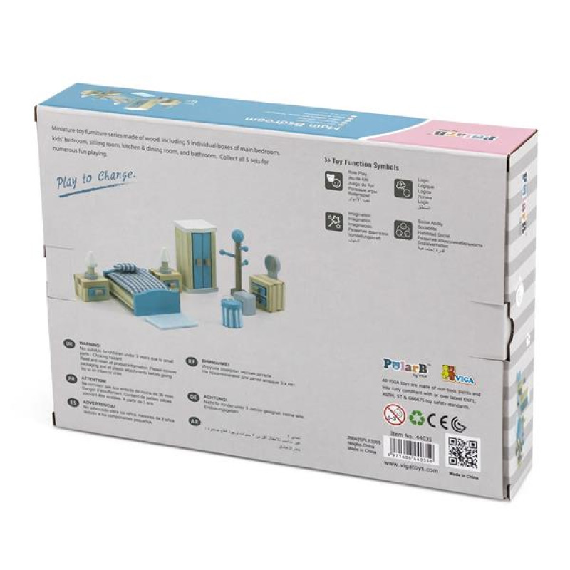 Кожна дитина знає, що в ляльок все має бути, як у дорослих: одяг, дозвілля і, звичайно ж, затишна кімнатка для відпочинку!Дерев'яні меблі для ляльок PolarB Спальня #8211; філігранна копія традиційної кімнати для сну. Набір розвивальних іграшок створений для сучасних дівчаток від 3 років як доповнення до лялькових наборів. У комплекті 9 мініатюрних предметів спальних меблів зі світу ляльок:- дерев'яне ліжечко з матрацом і подушкою: комфортне спальне місце для улюбленої іграшкової подружки;- світлий килимок під ноги: щоб у тендітної лялечки, яка щойно прокинулася, не мерзли ніжки;- дві тумбочки зі світильниками і висувними ящиками: у них зручно зберігати дрібні лялькові речі;- шафка з дверцями і вішалка для одягу: щоб весь ляльковий одяг завжди був на своєму місці;- туалетний столик із дзеркалом і табуреткою: тут можна причепурити лялечку, розчесати її, укласти волосся;- стильний закритий контейнер для білизни: щоб складати туди лялькові речі для прання.Завдяки такому детальному ігровому набору діти можуть програвати безліч придуманих історій, розвивати уяву, соціальні навички, приміряти знайомі ролі дорослих, розвивати роботу рук.Набір дерев'яних іграшок PolarB виконаний у спокійних синьо-білих тонах, які створюють атмосферу чистоти і затишної прохолоди. Кожен елемент дитячих меблів виготовлений із гладко відшліфованої деревини високої якості, відповідає стандартам дитячих іграшок EN71 і ASTM.