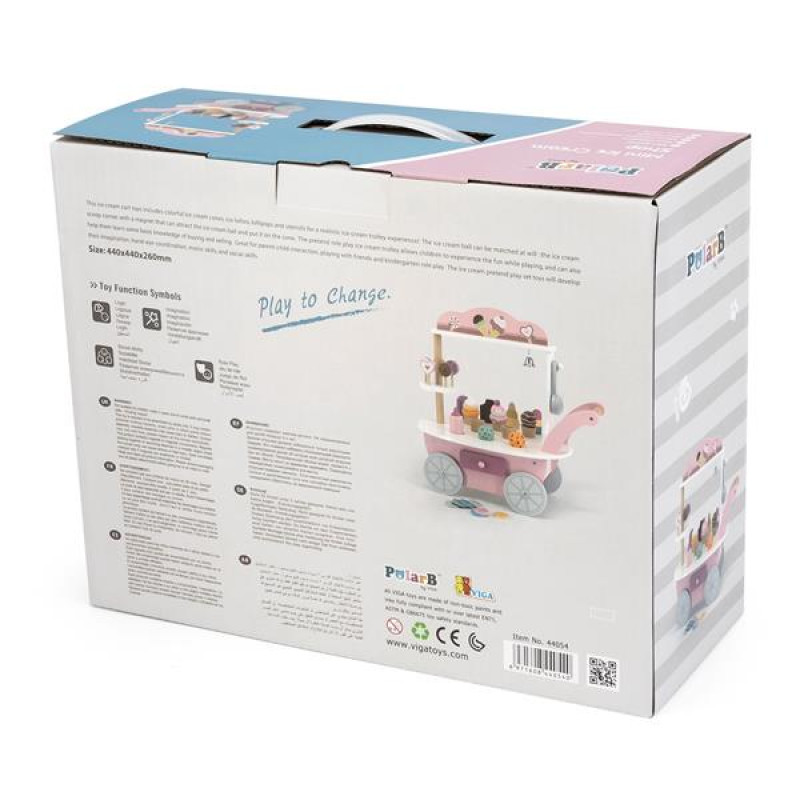 Дерев'яний ігровий набір PolarB Магазин морозива на колесах #8211; ще одна вдала розвивальна іграшка на тему кулінарії. Розроблена для сучасних дівчаток від 3 років.Міні-магазин складається з візка для приготування морозива, 16 аксесуарів і 20 монет. Він дозволяє організувати реалістичну гру, з легкістю перевтілитися в кулінара-кондитера або продавця морозива.Візок із 4 великими колесами і зручною ручкою для перевезення. Іграшковий магазин виконаний у ніжних біло-рожевих тонах, оснащений сріблястим дзвіночком для приваблення покупців. У вітрину вставляються яскраві десерти: морозиво і льодяники на паличках, пляшечка з топінгом. У кожну кульку морозива вмонтований магніт, завдяки якому він притягується до ріжки.У задній частині візка є ящик для зберігання монет. Там малюкам зручно підраховувати доходи і тримати в порядку касу.Дерев'яний ігровий набір PolarB Магазин морозива на колесах дозволяє в невимушеній формі соціалізувати дитину, дати їй базові знання про купівлю-продаж. У дітей розвивається уява, поліпшується моторика рук, сприйняття кольорів і форм. Вони вчаться спілкуватися, чути і розуміти один одного під час сюжетно-рольових ігор.Розвивальна іграшка PolarB виготовлена з екологічно чистого матеріалу відповідно до стандартів дитячих іграшок EN71 і ASTM.У наборі 37 предметів: 1 візок розмірами 44 х 26 х 44, 16 аксесуарів, 20 монет. Батарейки не потрібні.
