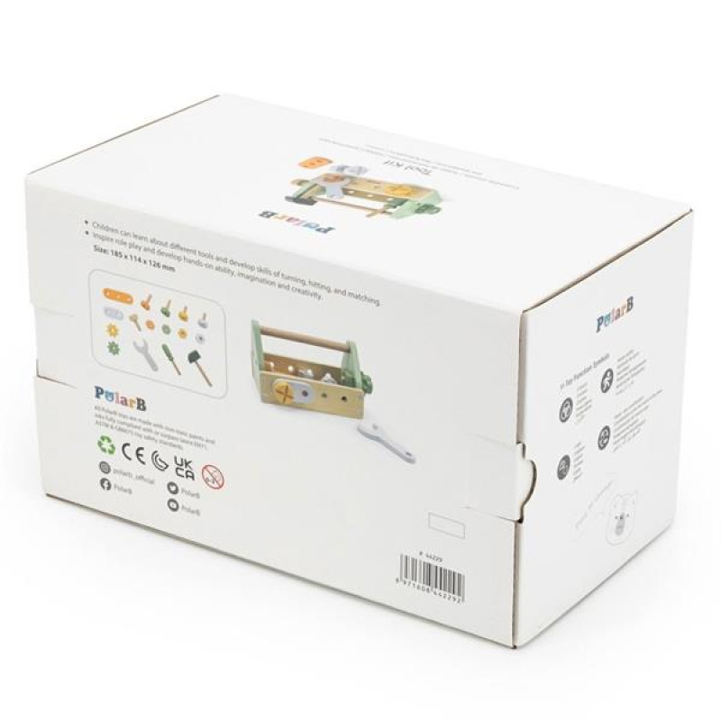 Чудовий подарунок для хлопчика #8211; дерев'яний ігровий набір PolarB Ящик з інструментами. Різнокольорові дерев'яні інструменти і детальки дадуть основу для сюжетно-рольових ігор. Розвивальний набір сподобається дітям від 3 років дошкільного віку.Гра з дитячими інструментами тренує дрібну моторику, око-ручну координацію, мислення, кмітливість, уяву. Хлопчик навчиться закручувати і відкручувати болтики і гайки, забивати гвоздики. Дерев'яні іграшки з набору познайомлять малюка з робочими інструментами та їх призначенням, надихнуть на ігри в майстра, ремонтника, інженера. Набір підходить для методики Реджіо.Процес пізнання світу у дітей включає наслідування дорослих. Іграшкові інструменти дають хлопчикові впевненість у здібностях, прагнення до самостійності, долучають до справ по дому.Розмір ящика з ручкою 19 х 11 х 13 см. У ньому зручно зберігати і переносити різнокольорові інструменти з деталями. Ігровий набір виконаний із міцної деревини із застосуванням гіпоалергенних фарб. Краї згладжені та відшліфовані начисто. Розвивальний дерев'яний набір відповідає міжнародним сертифікатам безпеки та якості дитячих іграшок: європейському EN71 і американському ASTM, як і вся продукція PolarB.У комплекті: молоток, гайковий ключ, викрутка, 4 пари гвинтів і гайок, дюбель, 2 шестерні та 2 панелі з отворами.
