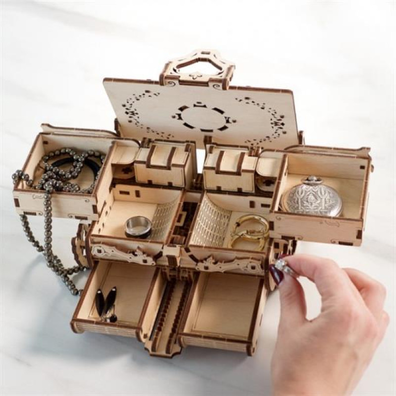 Витончена і елегантна Антикварна скринька від Ugears, створена, щоб надійно зберігати дорогі Вам речі, готова стати родзинкою Вашої колекції механічних моделей.Антикварна скринька виглядає як невелика механічна шкатулка з вісьмома відділеннями-секціями для зберігання різноманітних дрібниць, ювелірних речей і біжутерії. Що ж виділяє її серед інших скриньок?Антикварна скринька прикрашена вишуканою різьбою, що поєднує флористичний орнамент з елементами східних мотивів. Оригінальний дизайн приховує кілька цікавих секретів, один з яких - унікальний механізм Скриньки. Верхня кришка моделі запускає три основних робочих вузли. Два з них - дзеркально розташовані з двох сторін механізми, які розгортють верхні полички. Третій - висуває нижню шухляду, що знаходиться в середній частині шкатулки. Скринька розкривається, як квітка, і дає доступ до шести секцій для зберігання Ваших цінностей і прикрас. Але на цьому сюрпризи не закінчуються - секретна кнопка на задній стінці Скриньки відкриє дві потаємні комірки для найважливіших речей.Щоб все всередині Скриньки надійно зберігалося, закрита шкатулка додатково фіксується на замок-кліпсу. Після того, як Ви замикнете замок Скриньки, її можна нахиляти і перевертати. Всі дорогі Вам речі і прикраси будуть знаходитися на своїх місцях.Оригінальна, красива і практична Антикварна Скринька, в якій приємно і зручно зберігати дрібниці, ювелірні прикраси і біжутерію. Це саме той милий подарунок, який хочеться презентувати близьким і друзям або отримати самому.Як і всі інші моделі Ugears, Антикварна скринька - це механічний 3D-конструктор, який складається власноруч. У наборі Ви знайдете все необхідне для складання: деталі моделі вирізані точним лазерним методом у фанерних листах. Антикварну скриньку цікаво складати за ілюстрованою покроковою інструкцією, яка додається до моделі. Скринька виготовлена з натуральних матеріалів і приємно пахне деревом.Розмір моделі у замкненому виді: 17.5*14*10 смКількість деталей : 185Розрахунковий час складання : 2-3 годиниРівень складності : Середній