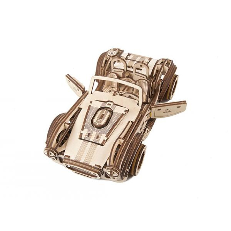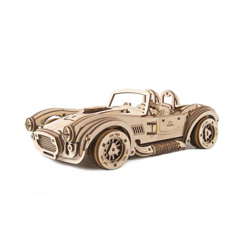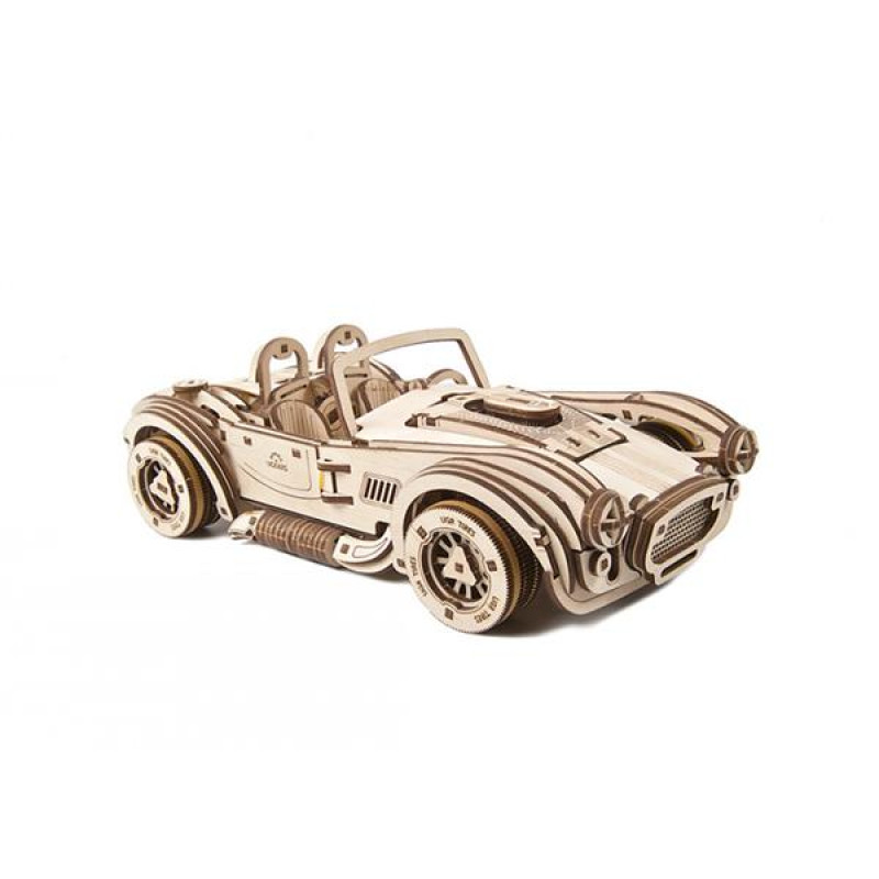 Представляємо Дрифт Кобра гоночний автомобіль - двомісний кабріолет із вишуканим ретро-дизайном - наша данина славетному спорткару всіх часів: Шелбі Кобра 427. Керований потужним пружинним двигуном, Дрифт Кобра гоночний автомобіль від Ugears має найшвидшу команду коней під капотом з будь-яких відомих нам механічних дерев’яних моделей автомобілів. Це авто заводиться за допомогою ручки, розташованої під кузовом. Перед тим, як завести свій дерев’яний гоночний автомобіль, перемістіть повітряний фільтр, який виступає з-під капота, у напрямку до лобового скла, і переведіть перемикач перед сидінням на стороні пасажира в положення «Lock» (паралельно дверям). Тепер зробіть 6–6,5 обертів ручки і - врум, врум! - ваш гоночний автомобіль готовий мчати! Встановіть важіль перемикання передач, розташований між сидіннями водія та пасажира, у потрібне положення (передній хід, задній, нейтральний). Покладіть свою Дрифт Кобру на рівну поверхню, зсуньте повітряний фільтр в бік напису «Start» і насолоджуйтеся захопливим видовищем.У моделі повертаються передні колеса, відчиняються двері, капот і багажник. Замість гумодвигуна, як у всіх попередніх моделях із автопарку Ugears, ми використали потужну пружину, щоб забезпечити міцність цього гоночного автомобіля та подовжити тривалість роботи моделі. Храповий механізм означає, що вам не доведеться утримувати ручку весь час, коли ви приводите модель у рух - потенційна енергія зберігається при кожному повороті, без прослизання, доки міцна внутрішня пружина не буде повністю заведена.Як ви вже здогадалися, особлива фішка цього гоночного автомобіля - здатність дрифтувати. Щоб перевести модель у режим «дрифт», повністю поверніть передні колеса в ту чи іншу сторону, покладіть її на гладку поверхню (наприклад, плитку), і подивіться, як модель імітує занос у бік. В ідеалі, Дрифт Кобра повинна зробити від половини до повного оберту навколо своєї осі, перш ніж поїхати вперед, залежно від поверхні руху та кута повороту коліс. Коли колеса цього механічного спорткара встановлені рівно, він може проїхати аж 8 метрів! Поверніть колеса більш плавно або покладіть Дрифт Кобру на менш слизьку та рівню поверхню - і вона поїде прямо і по колу, зробить два-три кола вперд або назад, залежно від того, куди повернуті колеса. Все, що вам потрібно для захопливого складання Дрифт Кобри, ви знайдете прямо в коробці. Деталі вирізані лазером у фанерних дошках, легко звідти виймаються та з’єднуються між собою без клею або будь-яких додаткових інструментів. Також у наборі є металева пружина, що забезпечує роботу механізму, і, звісно ж, покрокова ілюстрована інструкція 11 мовами.Розмір моделі: 25.5*21*11.5 смКількість деталей : 370Розрахунковий час складання : 9 годинРівень складності : Підвищений