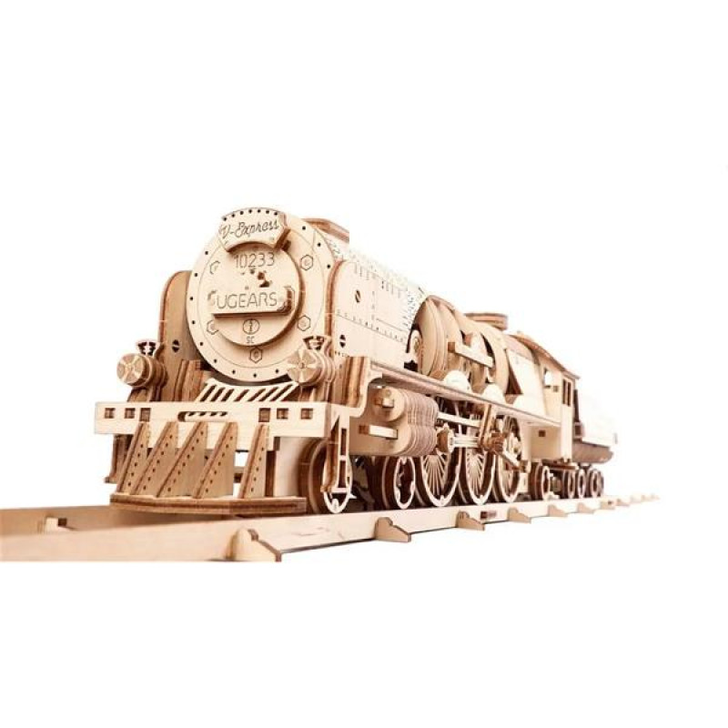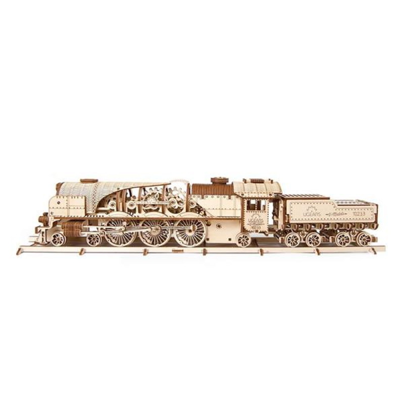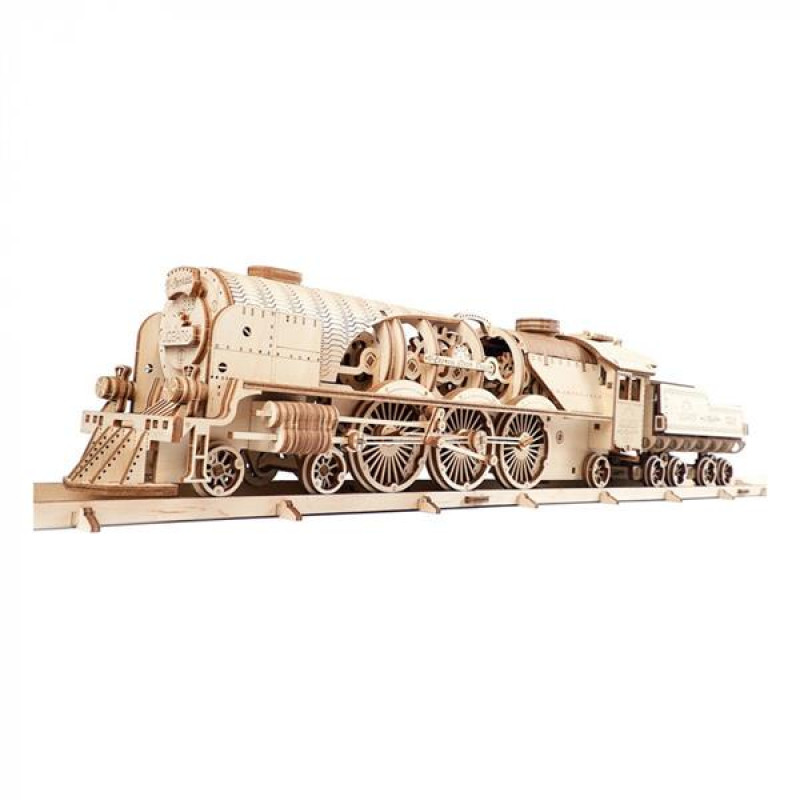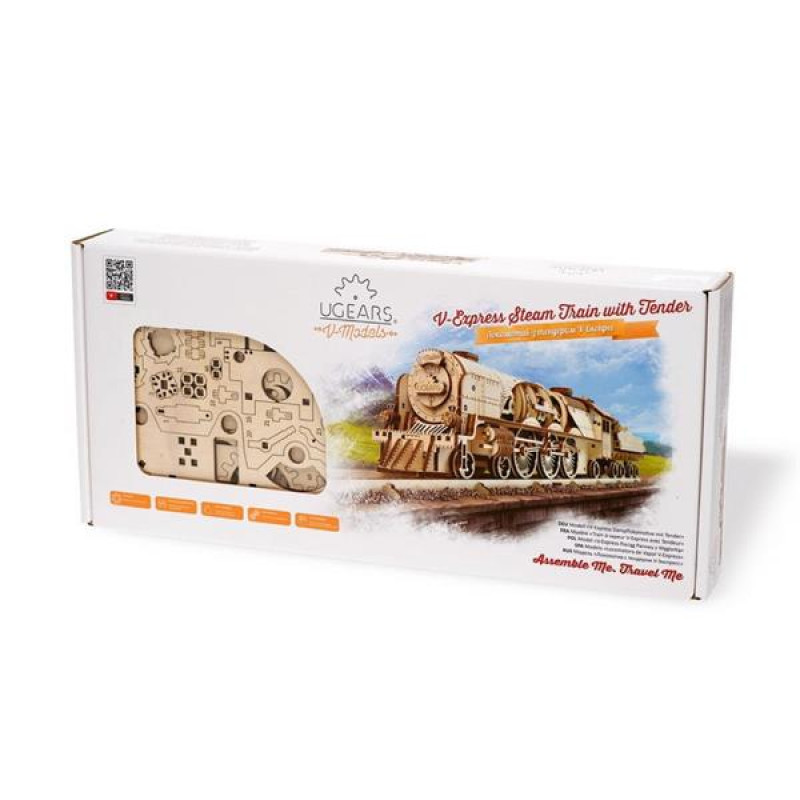 Головний символ Індустріальної революції, втілення потужності і краси, локомотив займає почесне місце в історії. Локомотив з тендером V-Експрес готовий відправитися з вами в подорож в цей захоплюючий період винаходів, відкриттів та інновацій.Максимально деталізований футуристичний дизайн моделі дозволяє, затамувавши подих, спостерігати за рухом деталей, за обертанням шестерень і маховика, вивчати роботу поршневого механізму - основних механічних вузлів справжнього локомотива.На одному заводі ваш новий локомотив проїжджає до чотирьох метрів. Напрямок руху перемикається невеликим важелем на корпусі моделі. Локомотив V-Експрес має три режими руху: вперед, назад і нейтральний. Саме в нейтральному режимі, запустивши механізм, ви зможете роздивитися, як працюють рухомі елементи моделі, перед тим як Експрес помчить по рейках вдалину. А переключивши локомотив на задній хід, можна здійснити автозчеплення з тендером, який є частиною моделі.Тендер моделі заслуговує на окрему увагу. Крім бортів, що піднімаються, причіпний вагончик має люк для подавання вугілля, що закривається на мініатюрну засувку. Так як на відміну від прототипів Локомотив V-Експрес працює не на вугіллі, а приводиться у рух гумомотором, в тендері є багато вільног