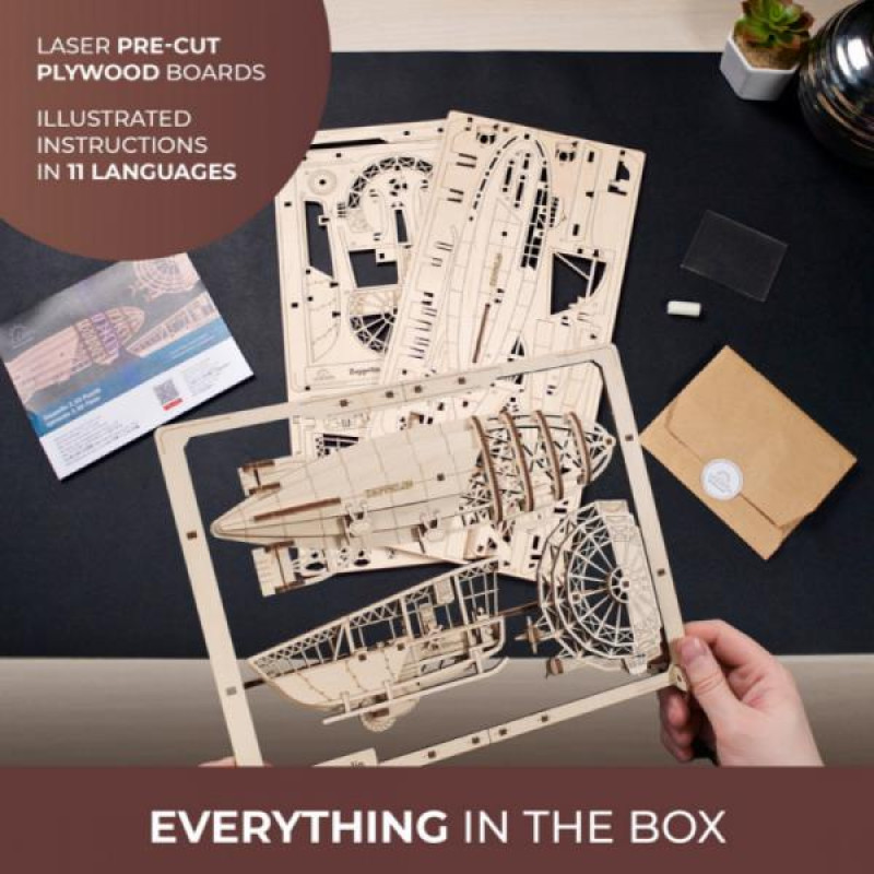 Представляємо Цепелін - перший у світі комерційний літак! Цей дерев’яний 2.5D пазл має рухомі елементи та вбудовану рамку, завдяки якій Цепелін можна повісити на стіну або поставити на стіл чи полицю. Ця об’ємна картина дозволяє уважно роздивитися дирижабль збоку та спереду, а також демонструє окремо кабіну в збільшеному вигляді. Пазл має кілька рухомих частин, зокрема гвинти, кермо та стабілізатори, які оживляють Цепелін просто у ваших руках!2.5D пазл Цепелін - це чудова альтернатива традиційним пазлам, моделі також складаються без клею, а ще мають впізнаваний дизайн Ugears. У коробці вже є все необхідне: віск, наждачний папір, інструкція 11 мовами (українською, англійською, німецькою, французькою, польською, іспанською, португальською, італійською, японською, китайською та корейською). Щоб скласти пазл, вийміть попередньо вирізані лазером деталі з фанери та з’єднайте їх разом. А потім насолоджуйтесь трьома ракурсами Цепеліна, уявляючи, як піднімаєтеся в небо на цьому дирижаблі з минулої епохи.Ви можете залишити Цепелін 2.5D пазл у натуральному «дерев’яному» кольорі або пофарбувати на свій смак (фарби не включені до набору). На відміну від традиційних пазлів, які потрібно приклеювати до основи, а потім монтувати в рамку, щоб зберегти та демонструвати їх іншим, ваш пазл Цепелін від Ugears уже має власну рамку зі спеціальними підставками та кріпленнями.Розмір моделі: 28,9*21,5*6,2 смКількість деталей : 49Розрахунковий час складання : 0.5 годинРівень складності : Легкий