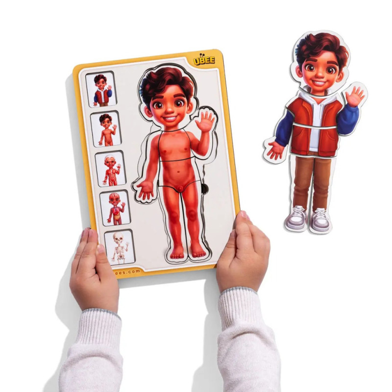 Тепер вивчати будову людського тіла можна не лише цікаво, а й весело! Дерев’яний сортер-пазл з 5 шарів – це відмінний спосіб познайомити дитину з основами анатомії. Цей багатошаровий пазл допоможе детально вивчити різні системи організму: від скелета до шкірного покриву, м'язів, кровоносної системи, а також зовнішнього вигляду людини в одязі.