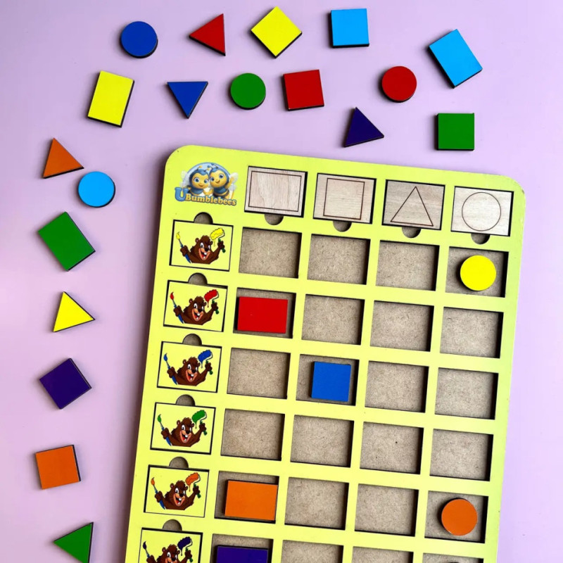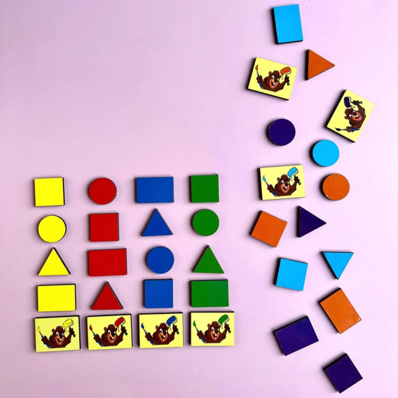 Сортер допоможе дитині легко вивчити різні геометричні фігури (28 штук в наборі) і кольори. Всі бобри і контури форм можна міняти місцями і сортувати під них фігури (за кольором валика і за формою контуру). Також фігури можна рахувати. Зручно діставати пальчиками.