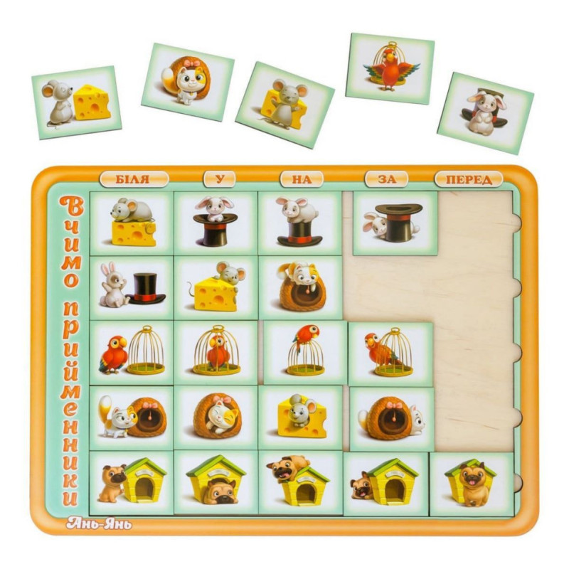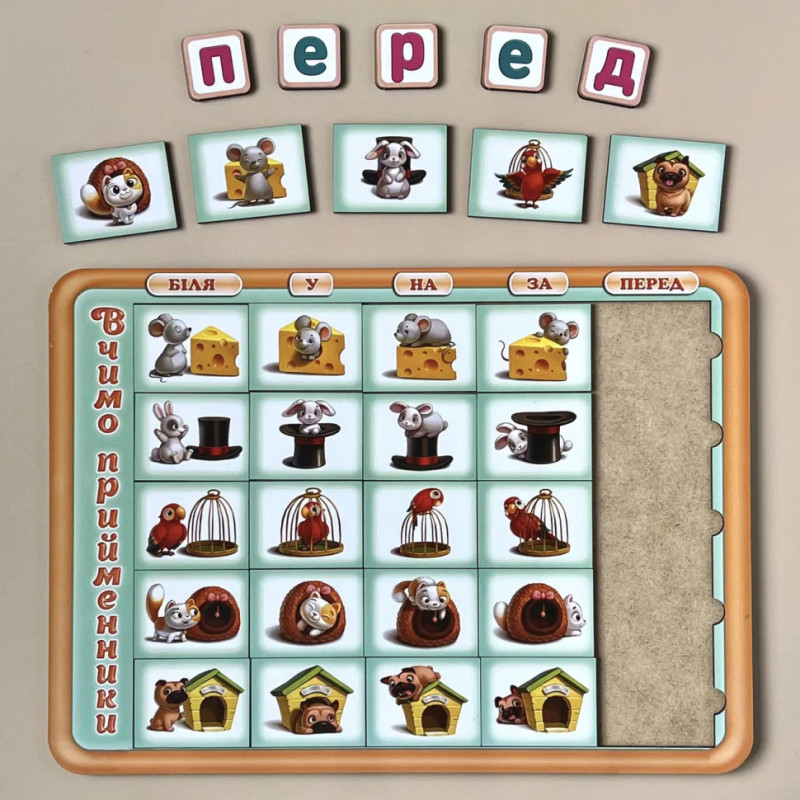 Сортер складається з планшета, на якому знаходяться 25 квадратних плашок із різними персонажами, що візуально демонструють значення п'яти різних українських прийменників: "біля", "у", "на", "за", "перед". Поговоріть із дитиною про тварин на малюнках. Порахуйте їх, дайте їм імена та придумайте історію про кожного персонажа так, щоб задіяти всі прийменники та показати їх наочно дитині.