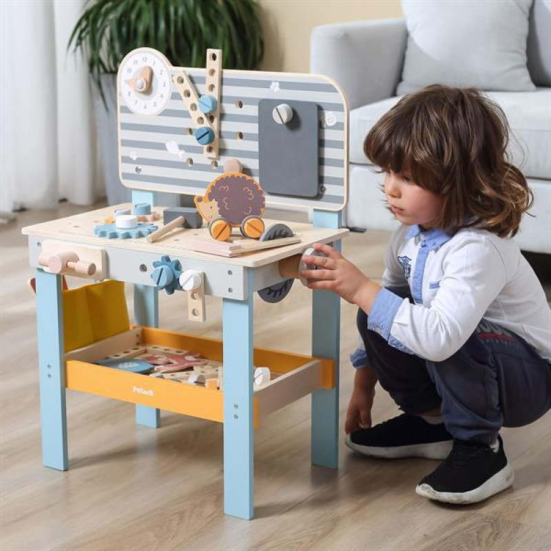 Подаруйте малюкові дерев'яний верстак з інструментами PolarB, щоб він відчув себе справжнім майстром! Набір повністю виготовлений із дерева. Дитина зможе забивати цвяхи молотком, закручувати шурупи гайковим ключем, пригвинчувати дерев'яні планки та шестерні до верстака. На іграшці є годинник зі стрілками, плоскі деталі у формі звірят, підвісні кишеньки та різні інструменти.Деталі зручно складати на поличці під столиком. Ігровий набір буде цікавий хлопчикам дошкільного віку від 3 до 5 років.Дитячий верстак дозволить запам'ятати назви інструментів та навчитися ними користуватися, розвинути дрібну моторику рук, мислення, координацію очі-руки. Верстак з інструментами підходить для виховання за реджио-методикою. Ігровий набір рекомендований для розвивальних ігор у дитячих садках і центрах.Дивлячись на дорослих, хлопчикам також хочеться показати свою майстерність, допомогти по господарству. Майстерня з інструментами для сюжетних ігор дає можливість дитині приміряти на себе роль слюсаря, столяра чи ремонтника. У нього будуть різнокольорові предмети для вивчення форм, тренування м'язів рук та уяви. Хлопчик дізнається про робітничі професії, вивчить інвентар. Рольові ігри також тренують емоційний інтелект.Усі деталі набору PolarB зроблені з цільного дерева, що робить їх міцними та довговічними. Дерев'яні інструменти гладенько відшліфовані для зручної гри.Ігровий набір PolarB якісний і відповідає стандартам безпеки: європейському EN71, американському ASTM. Розміри: 47 х 27 х 67 см, вага 3,2 кг.У комплекті дерев'яний верстак з інструментами та деталями. Упакований у фірмову картонну коробку із пластиковою ручкою.