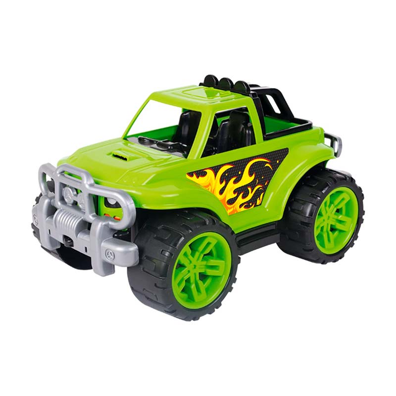 Саме для шанувальників джипів пропонуємо іграшковий спортивний позашляховик з відкритим кузовом та масивними бамперами-«кенгурятниками». На машині великі колеса з яскравим протектором, що легко долають різні перешкоди. У салоні авто можна розмістити невеликі іграшки та взяти їх з собою у подорож. Цікавий динамічний дизайн позашляховика неодмінно приверне увагу дітвори до іграшки. Кольорова гама та яскраві наліпки додають грі особливого драйву – так діти уявляють себе супер героями.