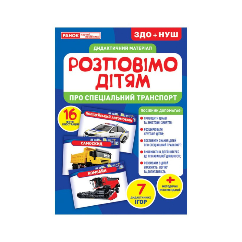 Комплект дидактичних матеріалів «Розповімо дітям. Про спеціальний транспорт» за програмою нової української школи рекомендовано використовувати під час роботи з дітьми молодшого шкільного та дошкільного віку. Наочність допомагає вчителям початкових класів та вихователям ЗДО в ігровій формі розповісти дітям про овочі, їхнє окультурення, їх користь для людини. Посібник з дидактичними матеріалами урізноманітнить заняття цікавими фактами, загадками, прислів’ями та приказками. Таким чином, діти краще запам’ятають вивчене.