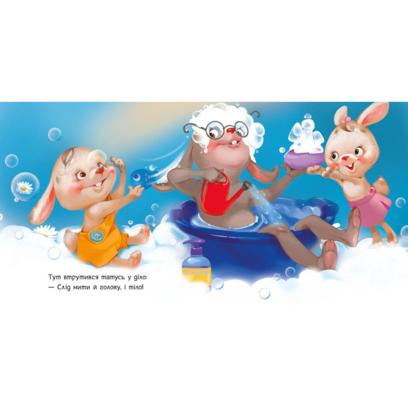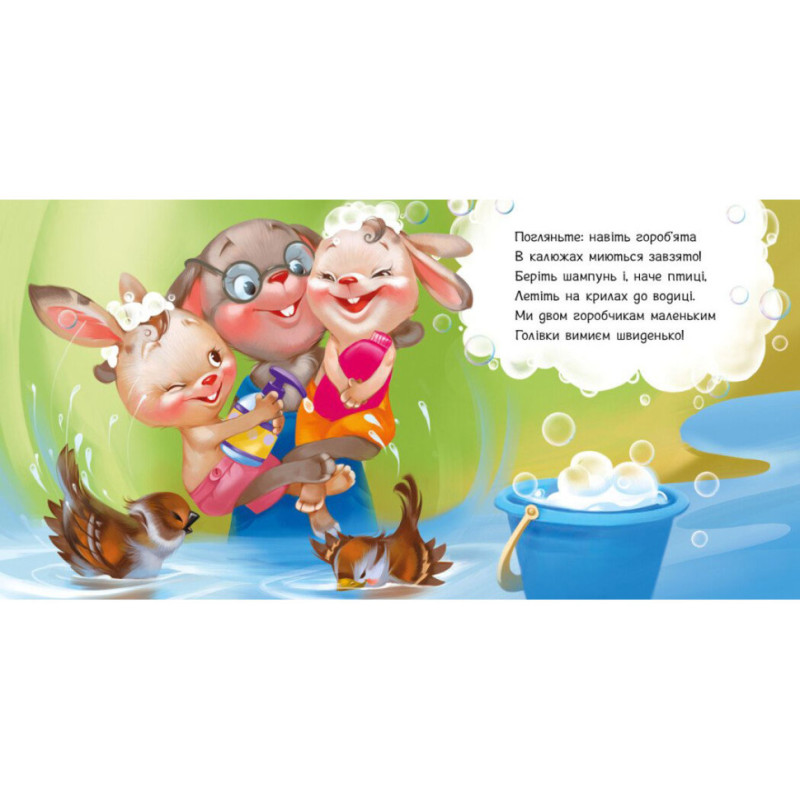Серія «Потрібні книжки» ― це корисні книжки для найменшеньких. Грайливі віршики про життя звірят допоможуть малюку легко виконувати чимало складних дитячих справ і завдань. А в цій книзі малі зайчата навчать дитину спокійно мити голову!