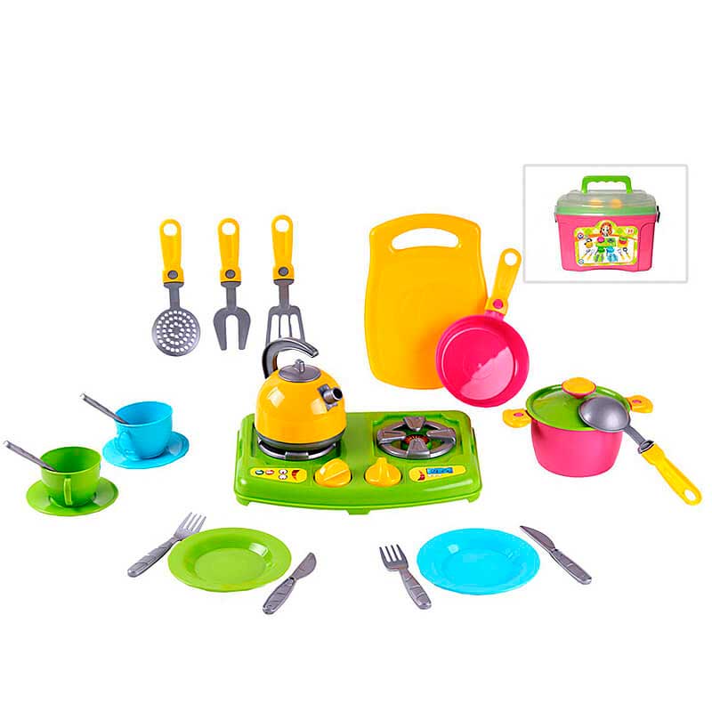 Кухонний набір №8 - іграшковий посуд упаковано в зручну пластикову валізку з ручкою і напівпрозорою кришкою.