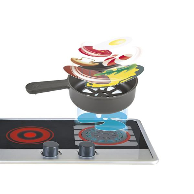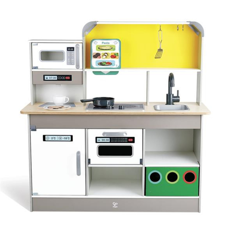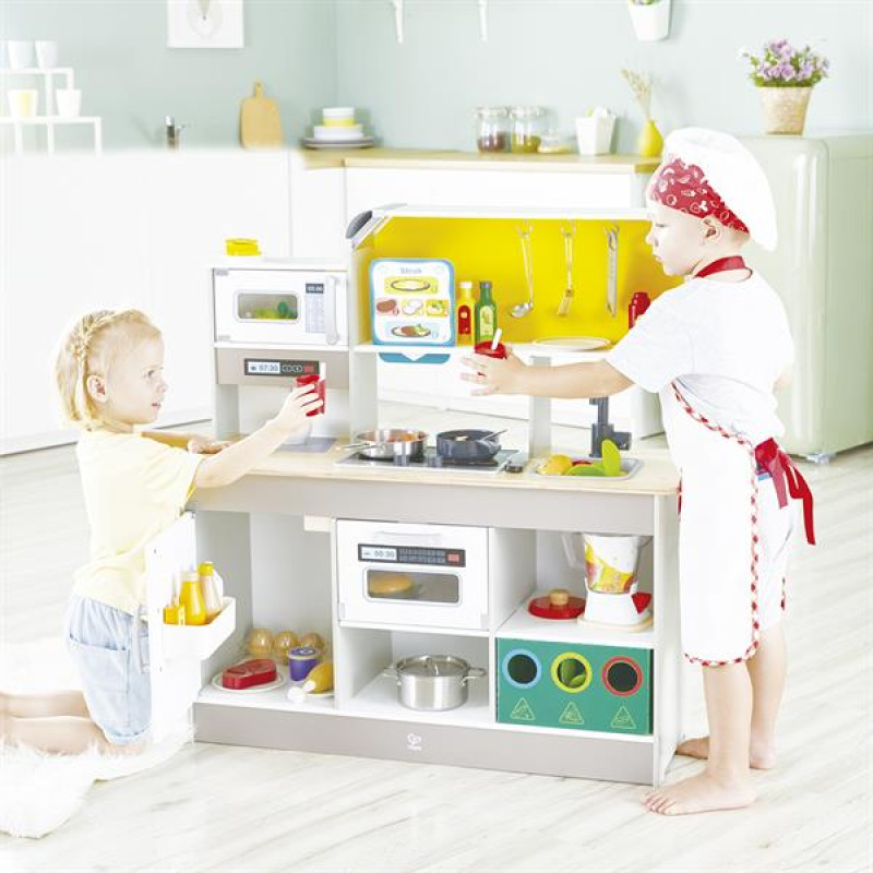 Здивуйте гостей та подайте смачну їжу з чудовою дитячою кухнею Hape Делюкс (E3178)! Це ідеальний подарунок для дітей віком від 3 років.На кухні є простора робоча поверхня з електричною плитою. Червона плита загориться і видасть звуки, що клекочуть. При включенні другої поверхні спалахує синій вогник і включається вентилятор. Завдяки цій хитрості, під час смаження продукти смішно підстрибують.У набір входить мікрохвильова піч, кавоварка, раковина з краном, холодильник та контейнер для різних видів сміття, яке навчить дитину сортувати та розділяти відходи. Також у комплекті є аксесуари: рецептурні картки з 6 стравами, продукти, сковорода з «особливим» дном, лопатка, чашка та блюдце.В іграшці є енергозберігаючий режим: вентилятор автоматично вимикається через 5 хвилин, якщо немає жодних активностей. Щоб відновити гру, потрібно натиснути кнопку знову.Граючи з дитячою кухнею Hape Делюкс дитина дізнається більше про ведення домашнього господарства, уявить себе у ролі кухаря. Приготування їжі за допомогою посуду та приладів з набору тренує спритність рук, уяву та логічне мислення. Граючи із друзями, дитина розвиває соціальні навички.Всі продукти Hape виготовлені із високоякісних матеріалів та пофарбовані нетоксичними безпечними для дітей фарбами.Дитяча кухня Hape відповідає міжнародним стандартам якості EN 71 та ASTM F963.Для гри батарейки не потрібні. Підзарядка походить від USB-кабелю, один кінець якого необхідно підключити до ноутбука або мобільного телефону, а другий вставити в спеціальний отвір у нижній частині плити.