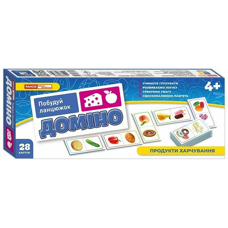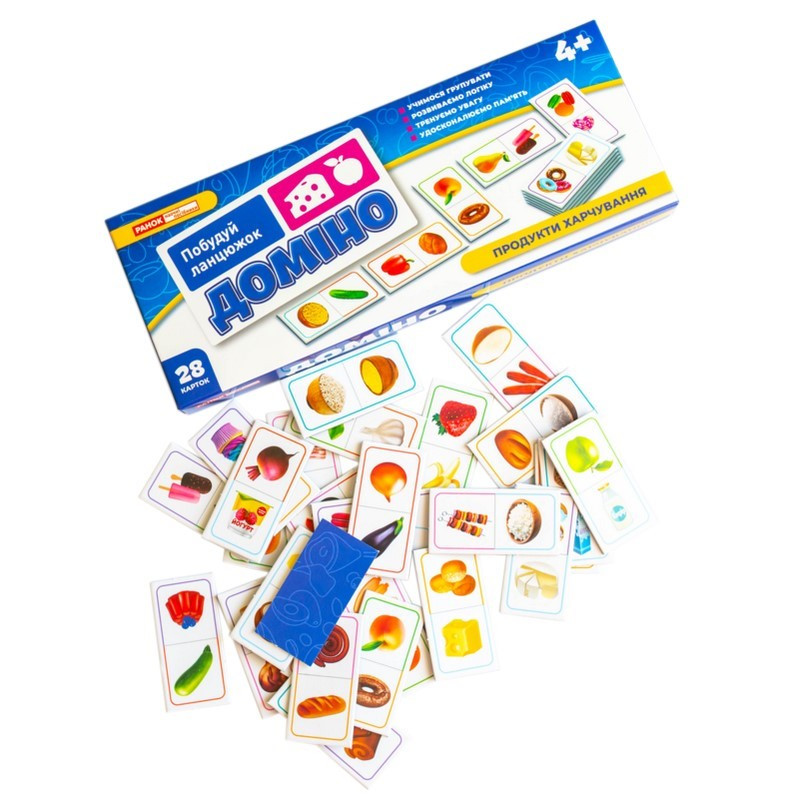 Доміно "Продукти харчування" - навчально-розвивальна гра для дітей віком від 4 років. У набір входить 28 міцних карток із яскравими зображеннями та простими правилами гри, що надруковані на упаковці. Кількість гравців: 2-4.