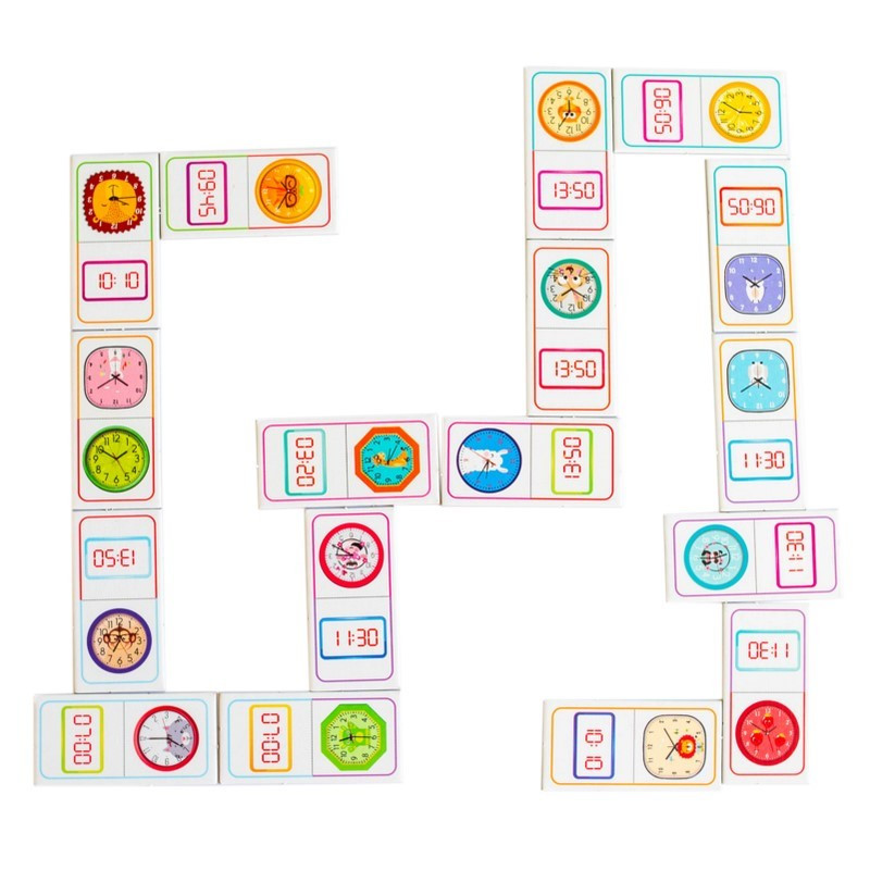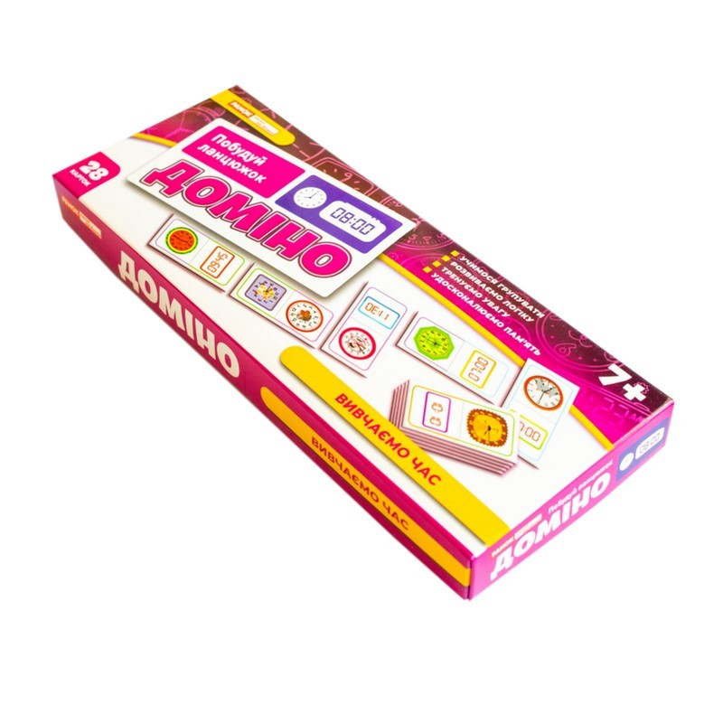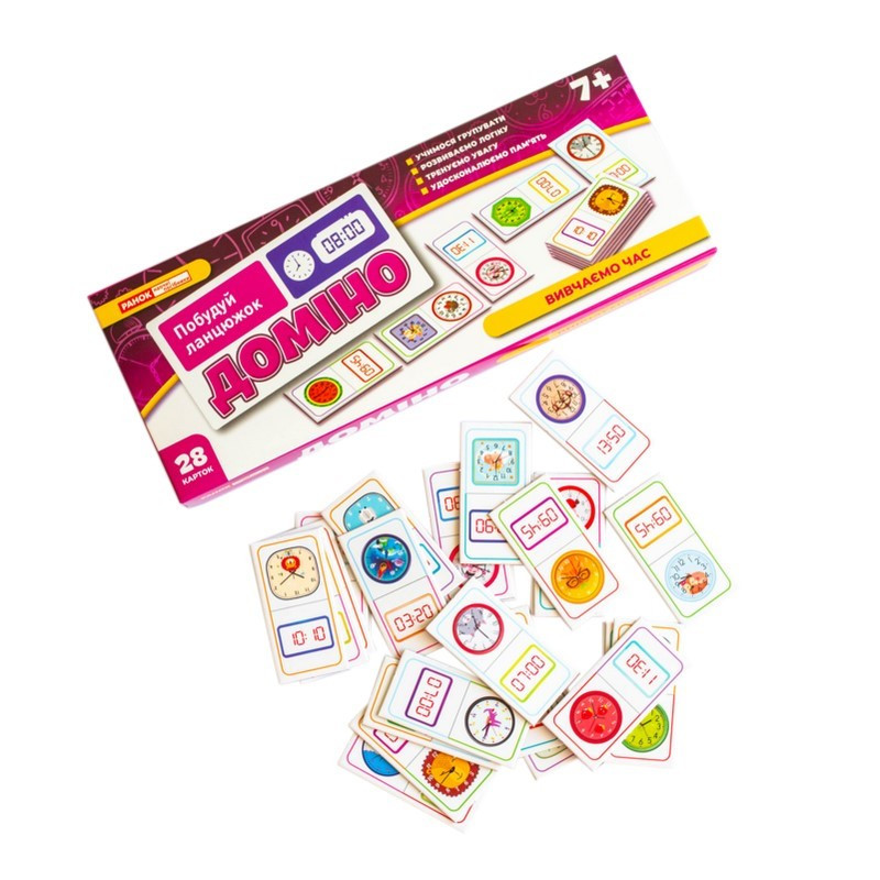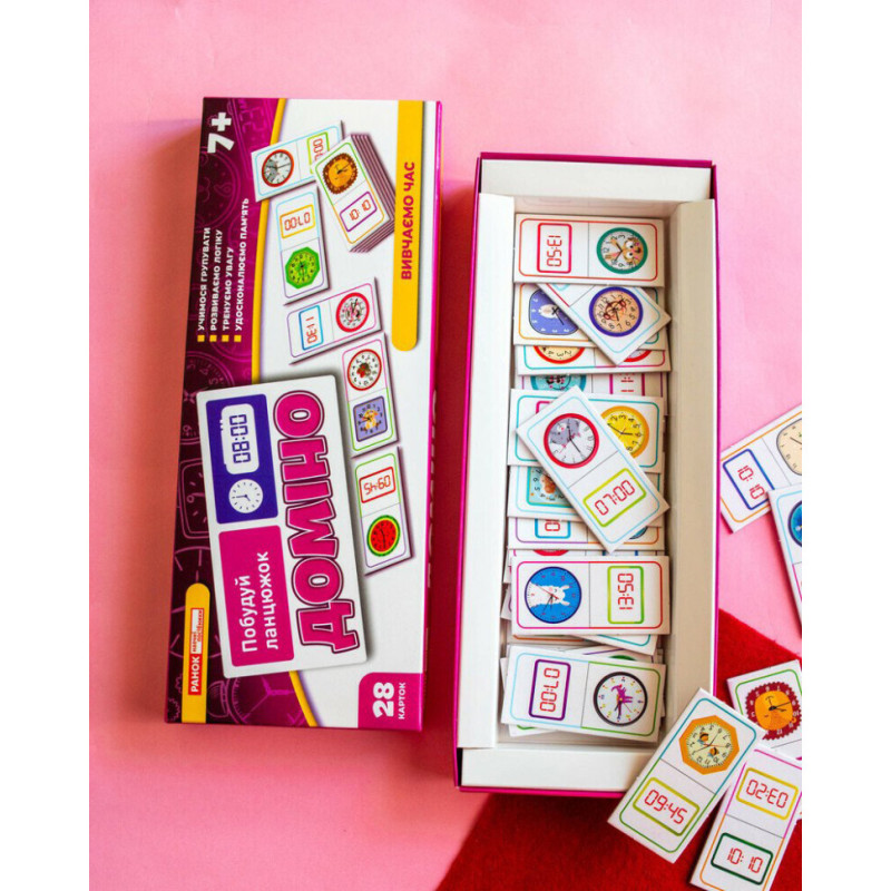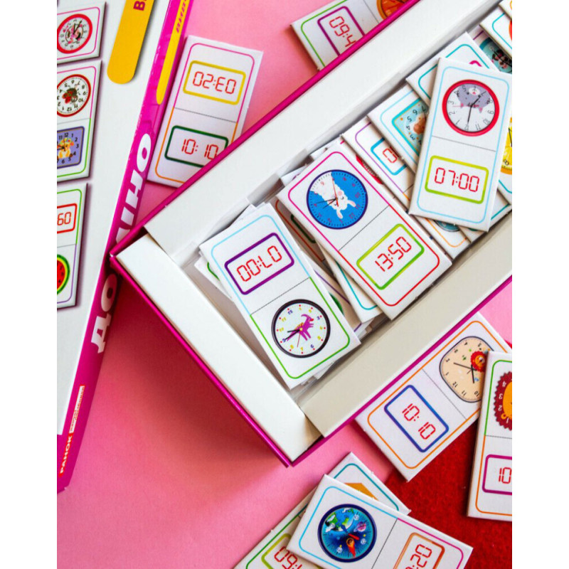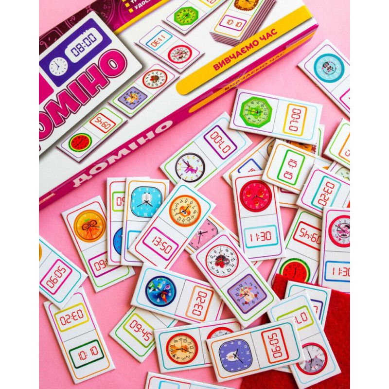 Доміно "Вивчаємо час" - не просто гра, а захопливий спосіб навчити дитину розрізняти час на електронному та механічному годиннику. Завдяки яскравим ілюстраціям, кольоровим підказкам і змагальному моменту, діти навчаються із задоволенням та без зайвого напруження.