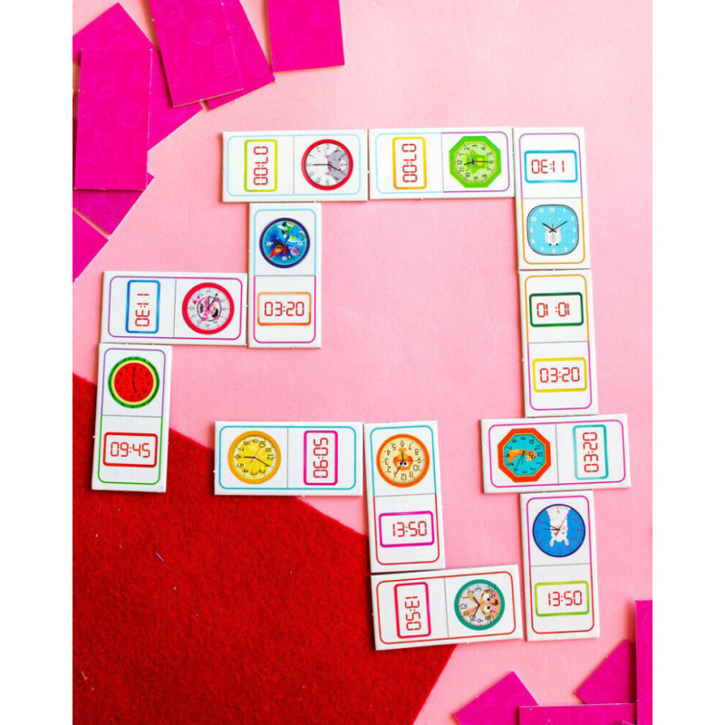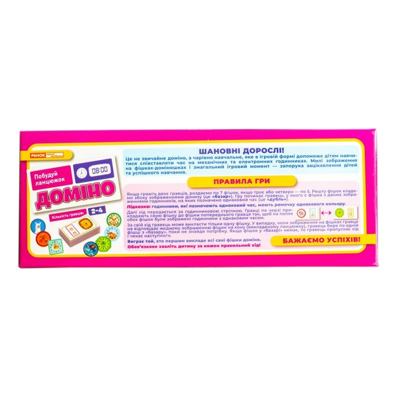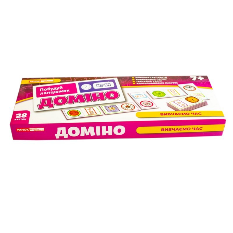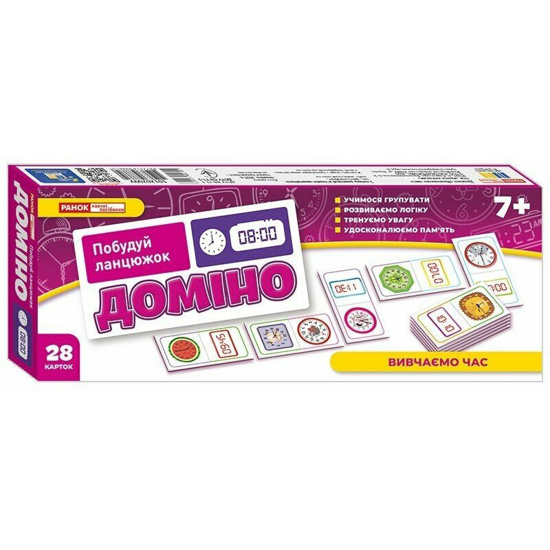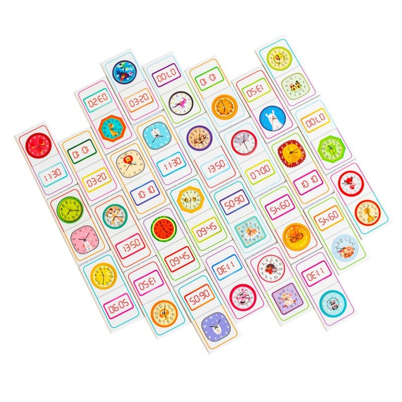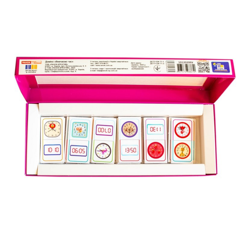 Доміно "Вивчаємо час" - не просто гра, а захопливий спосіб навчити дитину розрізняти час на електронному та механічному годиннику. Завдяки яскравим ілюстраціям, кольоровим підказкам і змагальному моменту, діти навчаються із задоволенням та без зайвого напруження.