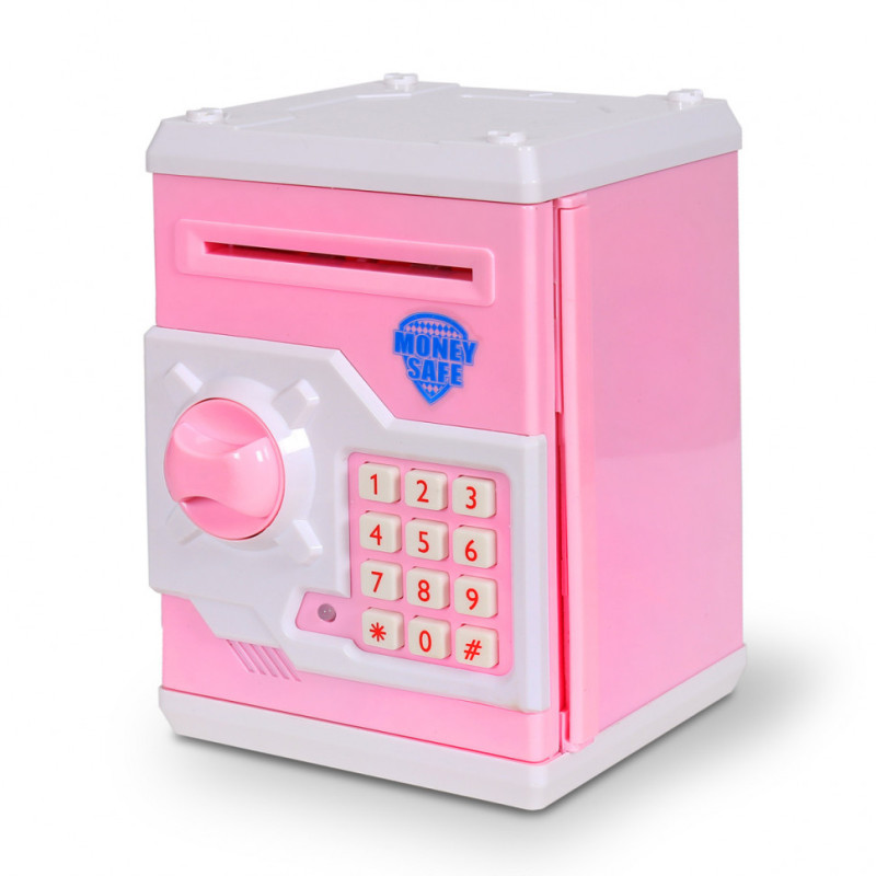 Скарбничка в формі сейфа буде цікавим подарунком для дитини. У скарбнички є отвори як для монет, так і для купюр. На дверцятах сейфа є кодовий замок. Набравши правильну комбінацію, можна відкрити дверцята сейфу. Є світлові і звукові ефекти (при відкритті / закритті дверцят). Виконаний з якісних і безпечних матеріалів.
