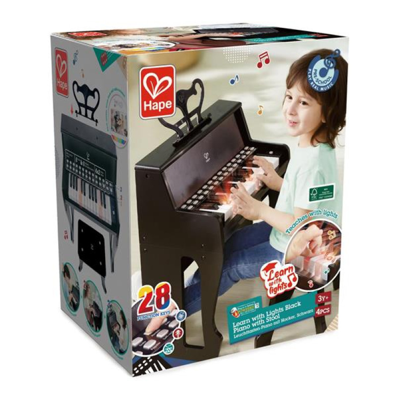 Це електронне піаніно з 25 клавішами - чудовий спосіб розпочати музичну подорож. Слідуйте за клавішами, що світяться, щоб навчитися грати. Ви можете обрати інструмент і грати під одну із шести стилізованих мелодій та восьми ударних.Дитяче піаніно Hape 25 клавіш зі стільчиком і підсвічуванням допомагає малюкам легко освоїти основи гри за допомогою підсвічування клавіш, щоб зіграти свої перші твори.25 клавіш і зручне сидіння, різні звуки інструментів, 6 простих мелодій для гри і 8 ударних ритмів роблять процес навчання захопливим, коли для гри не потрібно ніякого досвіду або знань про музику.Впевненість у собі будується швидко, коли діти грають разом з однією з 6 красивих мелодій і обирають один із 8 барабанних ритмів.Музичні шедеври можуть бути записані та відтворені, щоб насолодитися ними пізніше.Підходить для дітей віком від 3 років.Розміри піаніно у зібраному вигляді: 38,2 х 49,5 х 23,8 см. Розміри стільчика: 33 х 23 х 19,5 см.