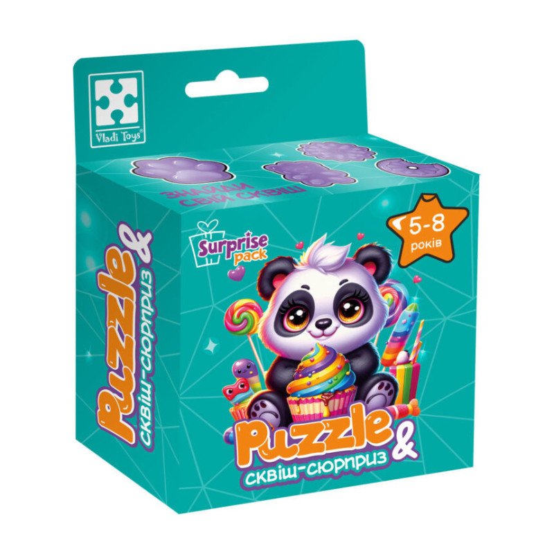 Гра розвиваюча пазли із сюрпризом “Панда” VT8030-08 перенесе дитину у солодкий світ, де чарівна пандочка ласує смачнющим кексом. Але магія на цьому не закінчується! Усередині коробки ховається сквіш-сюрприз — трендова іграшка, яку обожнюють діти. Дізнайся, який з цих м’якеньких сюрпризів чекає саме на тебе.