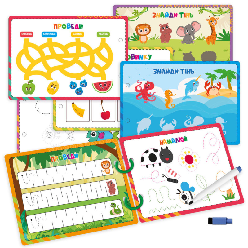 У комплекті — 9 міцних двосторонніх сторінок (усього 18 картинок і завдань) та маркер, який легко стирається, щоб можна було повторювати вправи знову і знову.