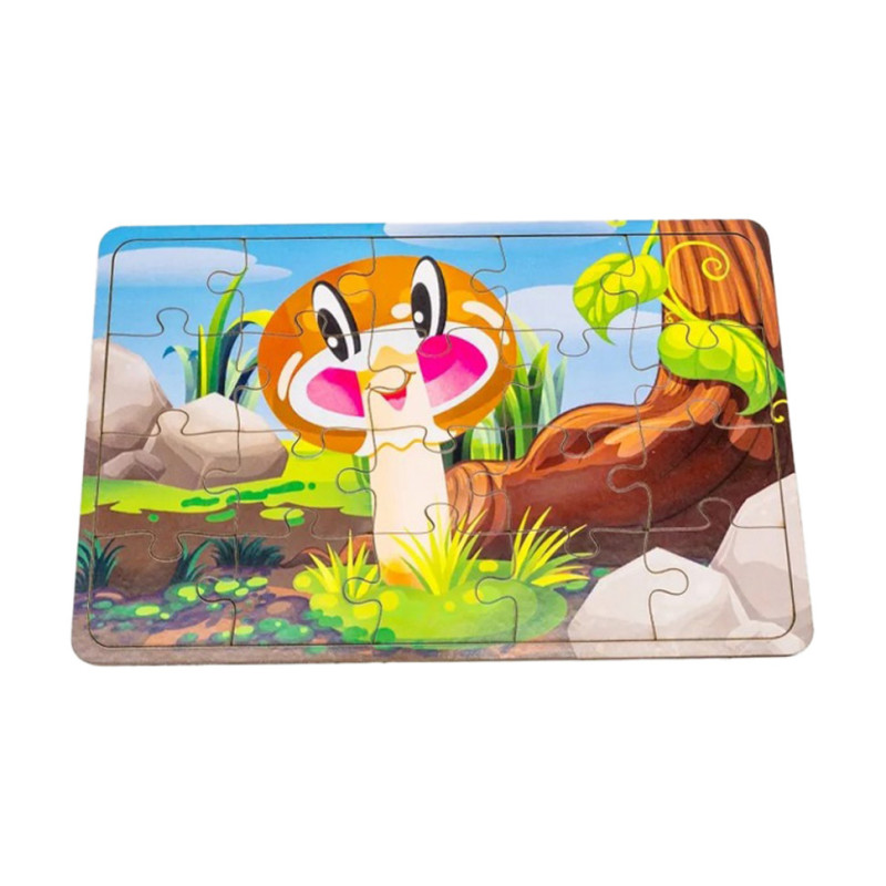 Набір включає рамку-основу, куди потрібно помістити 20 різних за формою деталей, відтворивши малюнок-зразок. Всі елементи виготовлено з тонкої шліфованої хвилясто-деревної плити, щільної, міцної, із старанно обточеними краями; та рисунком, нанесеним безпечними стійкими фарбами. Допоможіть вашій дитині скласти свій перший пазл у вигляді яскравого білого грибочка.