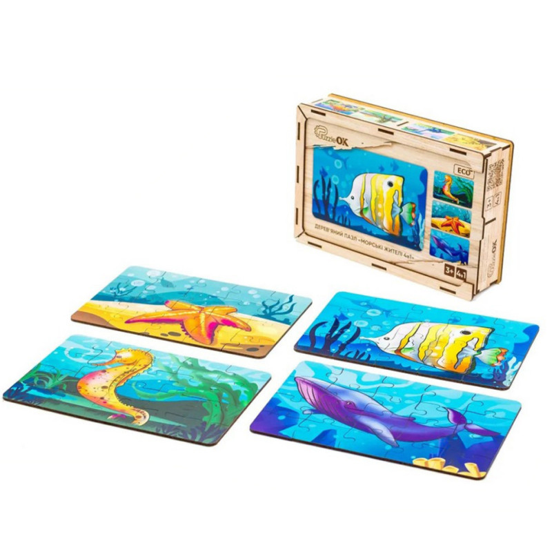 У комплекті дитина знайде 4 пазли із зображеннями морської зірки, рибки, кита та морського коника. Складання пазла сприятиме розвитку уваги, дрібної моторики, посидючості.