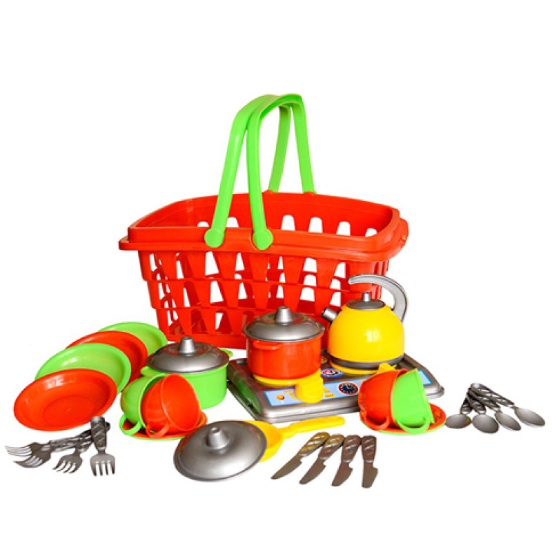 Кухонний набір у місткій корзині – справжня знахідка для маленької господині. Яскраві кольори та різноманіття посуду неодмінно привернуть увагу малечі та батьків.