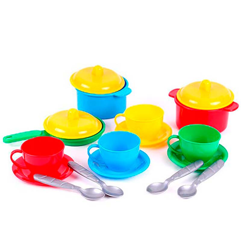 У комплекті: 1 сковорідка, 2 каструльки, 3 кришки, 4 блюдечка, 4 чашечки, 4 ложечки.
