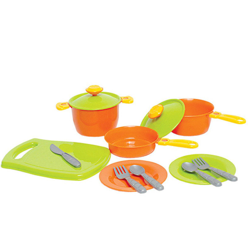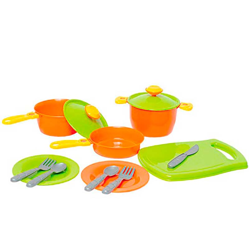 Іграшка «Набір посуду ТехноК» неодмінно сподобається малюкам за цікаву комплектацію та приємні кольори. Варіантів гри з іграшкою безліч – готувати обід для себе та матусі, накривати стіл для друзів та запрошувати ведмедиків в гості. Набір виготовлений у яскравих соковитих кольорах. Особливу привабливість посуду надають кольорові ручки сковорідки, каструлі та інших елементів. "Родзинкою" набору є кухонна дощечка.
