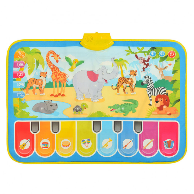 Інтерактивний килимок «Зоопарк» озвучений на двох мовах, українською та англійською. Виріб м'який і приємний на дотик. Живиться іграшка від 3-х батарейок типу ААА (мізинчикові). Відділ для батарейок щільно прикручується гайкою для максимальної безпеки гри дитини.