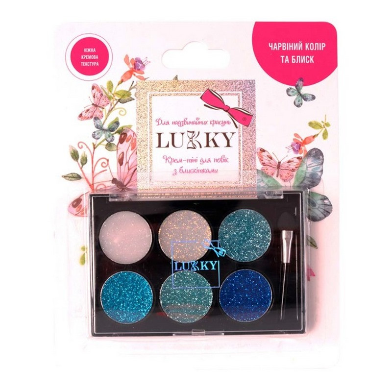 Крем-тіні для повік Lukky 6 відтінків із блискітками створять неповторний образ для дівчинки. Підійде для юних модниць. Тіні світло-блакитних і синіх відтінків доповнені блискітками. Текстура кремова й абсолютно безпечна для дитячої шкіри. У наборі: 6 відтінків тіней для повік; аплікатор. Рекомендовано для дітей від 6-ти років.