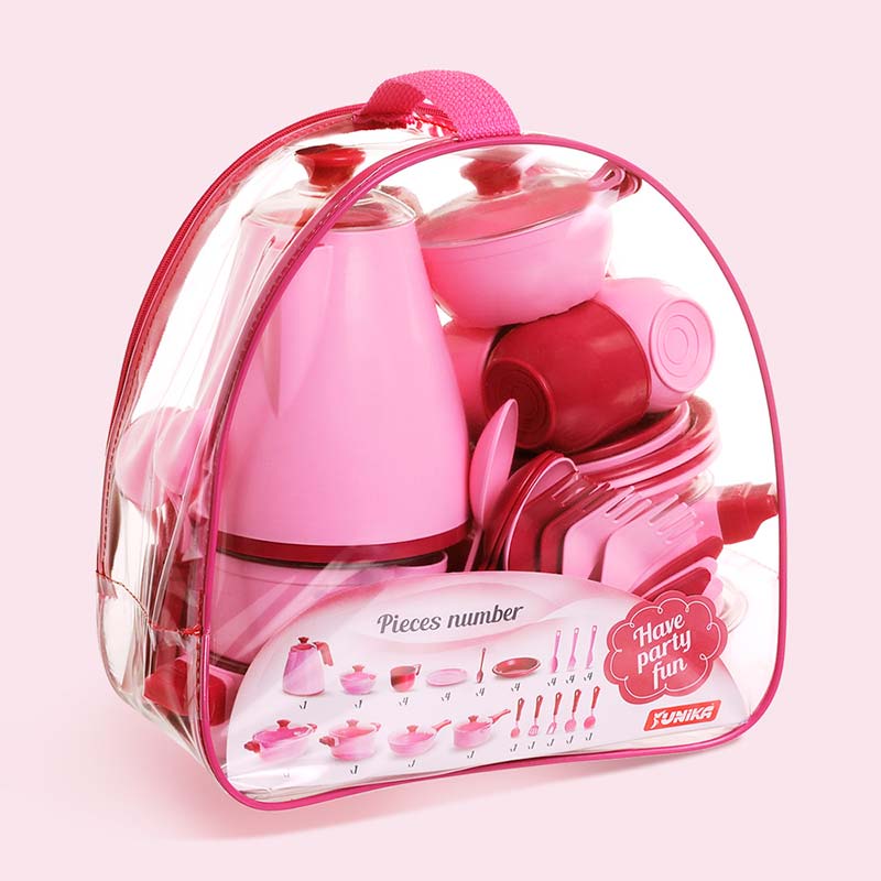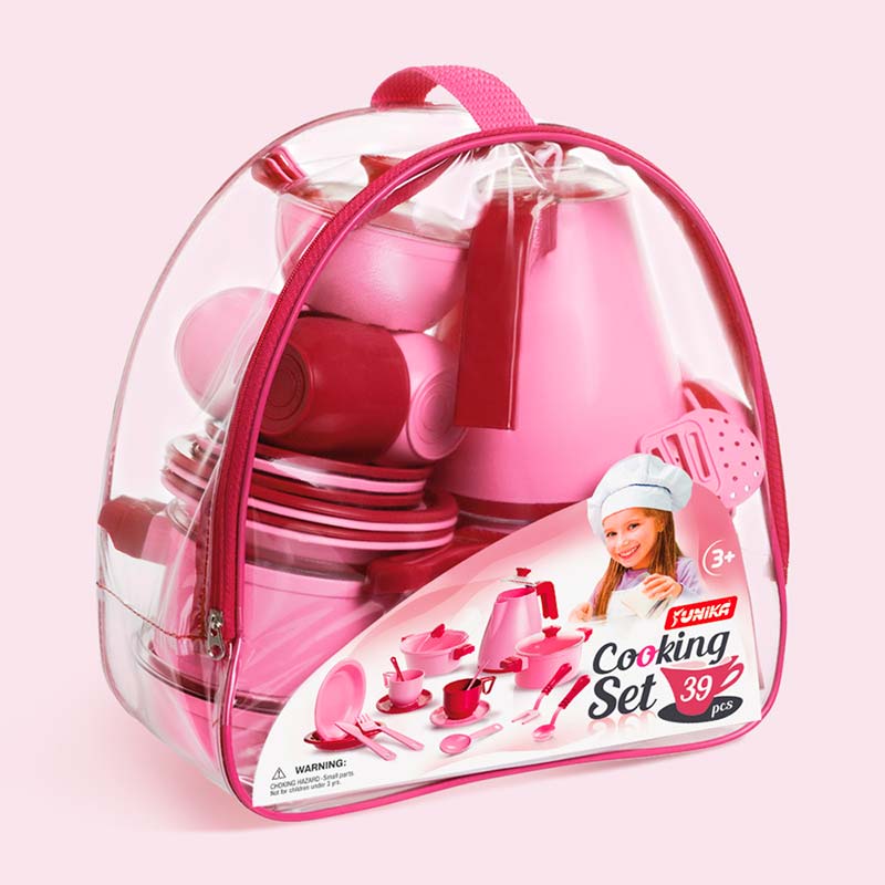 Набір включає в себе різноманітні предмети, необхідні для гри в кухні, такі як каструлі, сковорідки, ложки, відерце, тарілки і т. д. Це дозволяє дітям відтворювати справжні кулінарні пригоди.