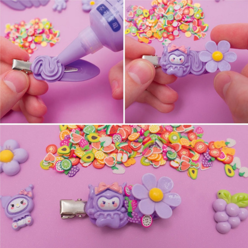 А ще в цьому наборі ви знайдете п'ять чудових кабошонів. Вони стануть серцем шпильок, тому що на їх фіолетових основах можна викласти казкові візерунки за допомогою чарівного клей-крему. А щоб прикраси були ще більш особливими, набір для декорування приховує безліч секретних інгредієнтів: це і квіточки, і симпатичні мультяшні герої, і яскраві дрібнички у вигляді фруктової нарізки, які зроблять кожну шпильку схожою на скарб з королівської скриньки, якщо вони засиплють весь вільний простір навколо головних елементів!